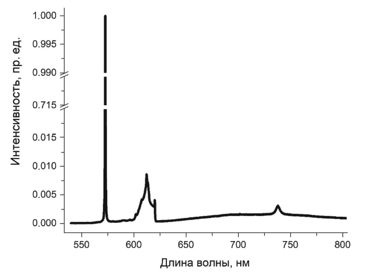 Спектр фотолюминесценции образца № 1 при возбуждении лазером с длиной волны 532 нм представлен на рис. 2. Рамановский спектр и спектр фотолюминисценции образца 2 практически полностью совпадали с соответствующими спектрами образца № 1.