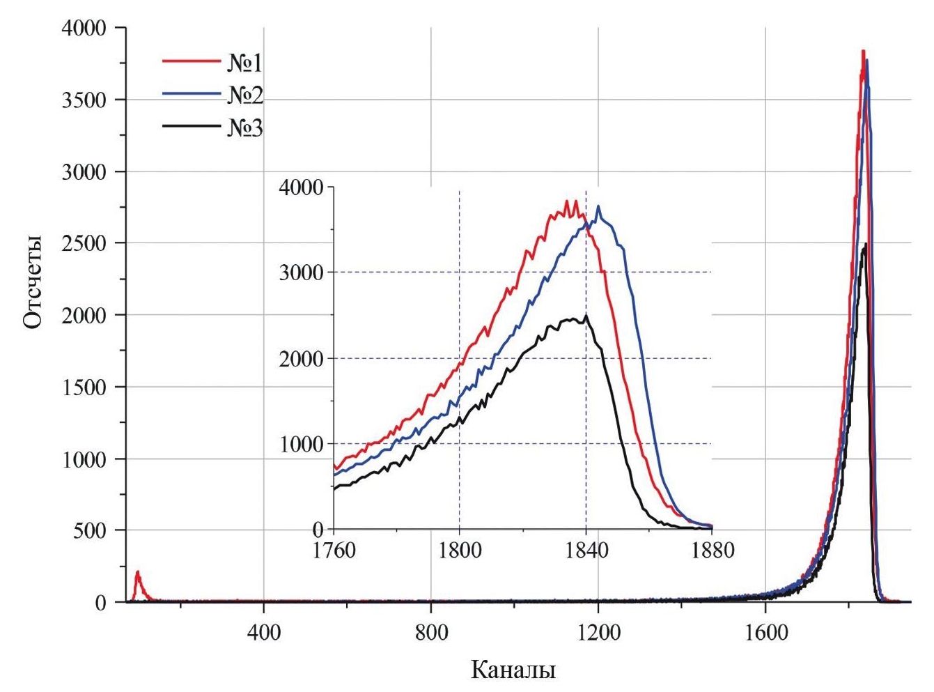 Амплитудные спектры детекторов на образцах № 1, № 2 и Е6 при облучении альфа-частицами источника 241Am и ИНГ-07Т представлены на рис. 4 и 5 соответственно.