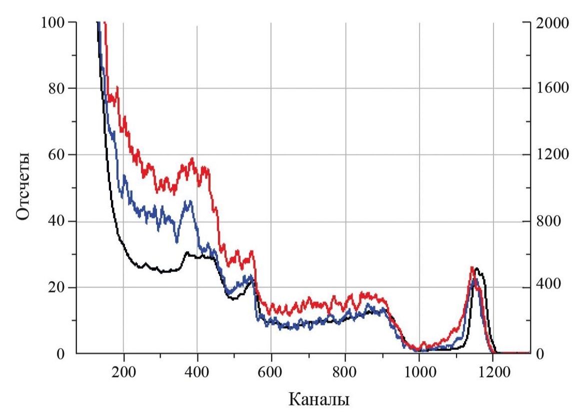 Рис. 5. Амплитудные спектры детекторов на образцах № 1 (красный), и № 2 (синий) и Е6 (черный) при облучении ИНГ-07Т2, 300 с, 5 см до мишени, 130 кВ, 100 мА.