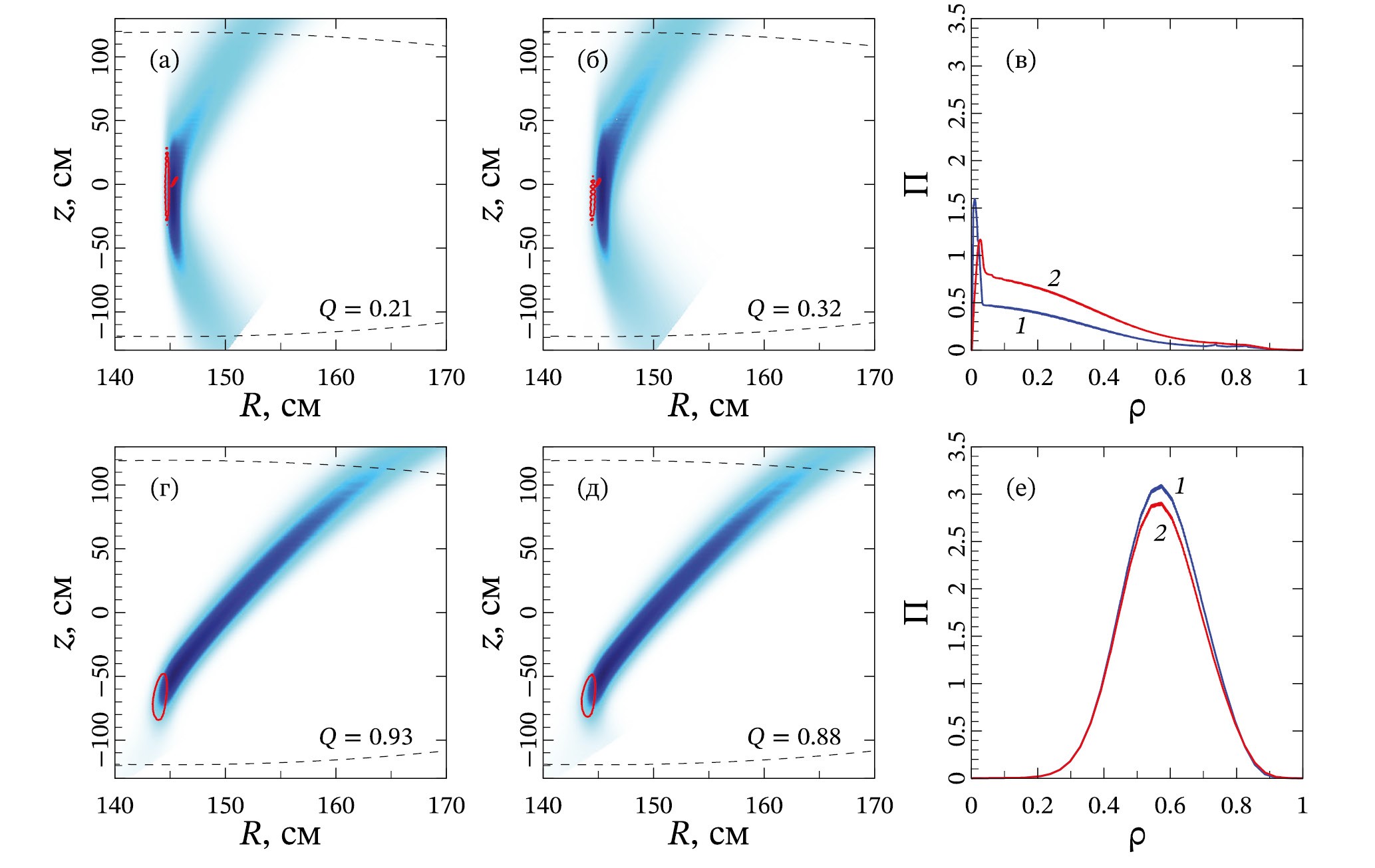 3. Fig. 2. Simulation of propagation and absorption of quasi-optical wave beams in tokamak plasma: scenario of EC heating at the third harmonic with radiation input at an angle of 5  to the vertical (upper row) and 10  to the vertical (lower row). The wave field intensity distributions | u | 2 in the poloidal cross-section of the tokamak are shown, calculated without taking into account the diffusion terms in the first order of perturbation theory (a, d) and with taking into account the diffusion terms in the second order of perturbation theory (b, d). The solid red line highlights the region of microwave power absorption, determined by the level max (dP / dV) / 2 ; the dotted line denotes the plasma boundary. The graphs (c, e) show the absorbed power profiles П(ρ) with (2) and without (1) taking into account the diffusion terms.