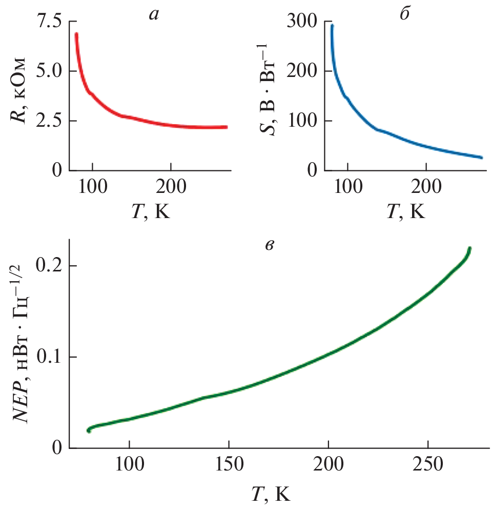 Свойства плазмонного детектора субтерагерцового излучения на основе кремния изучены в широком диапазоне температур, вплоть до азотной. Получены температурные зависимости чувствительности детектора, а также изучены его шумовые характеристики. Частотная зависимость чувствительности в диапазоне 70–120 ГГц была получена при комнатной температуре, при этом максимальное значение чувствительности, достигаемое на частоте 96 ГГц, составляло 25 В/Вт. Шумовой эквивалент мощности исследуемого детектора был оценен в предположении, что основным источником шума является шум Найквиста, и изменялся от значения 2 ⋅ 10–10 Вт ⋅ Гц–1/2 при комнатной температуре вплоть до 2 ⋅ 10–11 Вт ⋅ Гц–1/2 при температуре жидкого азота. Дополнительно были исследованы вольтамперные характеристики суб-ТГц детектора. Обнаружено, что в дифференциальном сопротивлении и чувствительности возникает особенность в зависимости от приложенного постоянного напряжения при переходе от комнатной температуры к азотной.