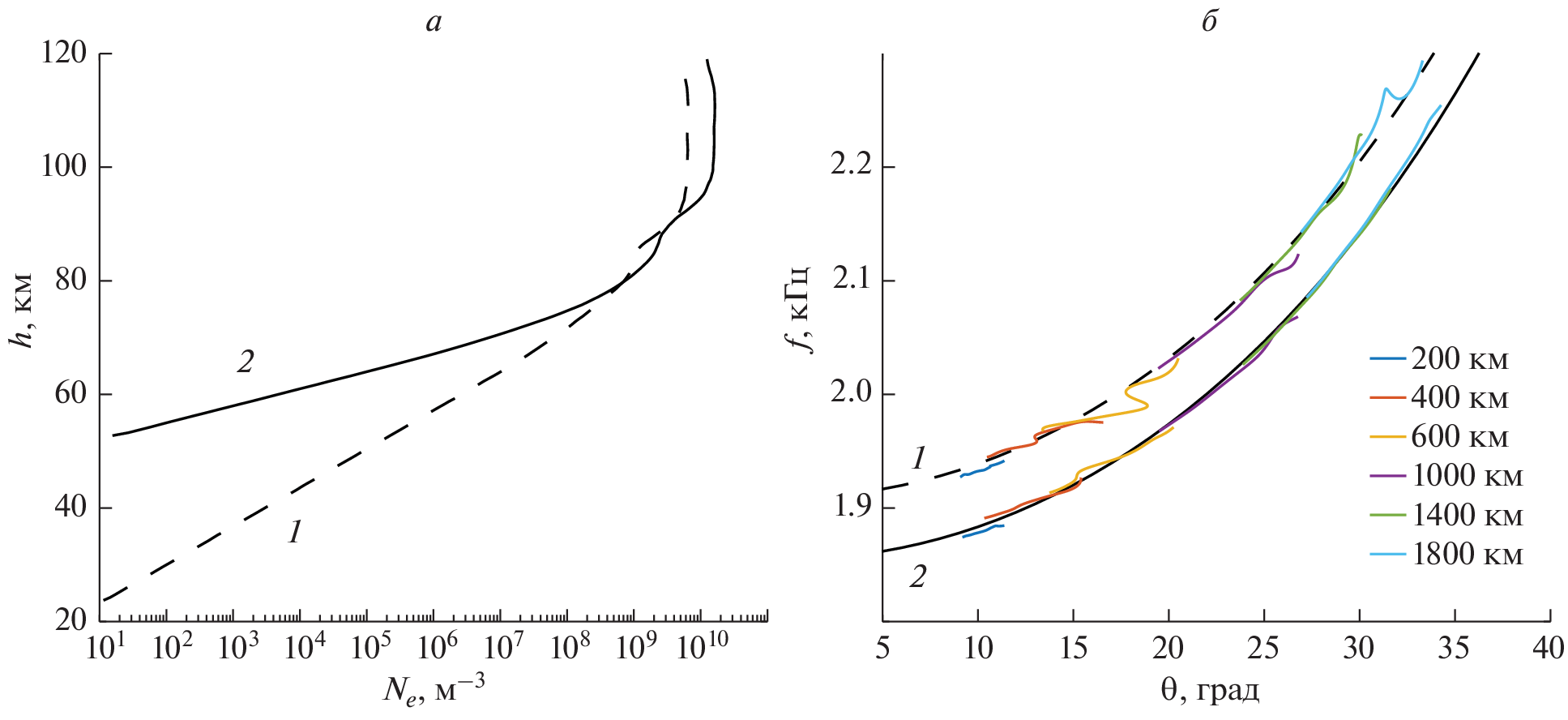 Experimental data on the registration of signals from tweek-atmospherics and an ionospheric source formed because of heating of the ionosphere at frequencies higher than the frequency of the first transverse resonance of the Earth–ionosphere waveguide (~1.8 kHz) are considered. It is shown that, far from the source, at frequencies near the resonance, almost complete circular left-hand polarization of the horizontal magnetic field is observed, and the angles of incidence are small and range from 10° to 35°. A joint analysis of observational data and simulation results showed that it is possible to calculate the effective reflection height from estimates of the incidence angle, which can be used to diagnose the lower ionosphere. But, in the case of an ionospheric source, it is important to take into account the inhomogeneity of its radiation pattern.