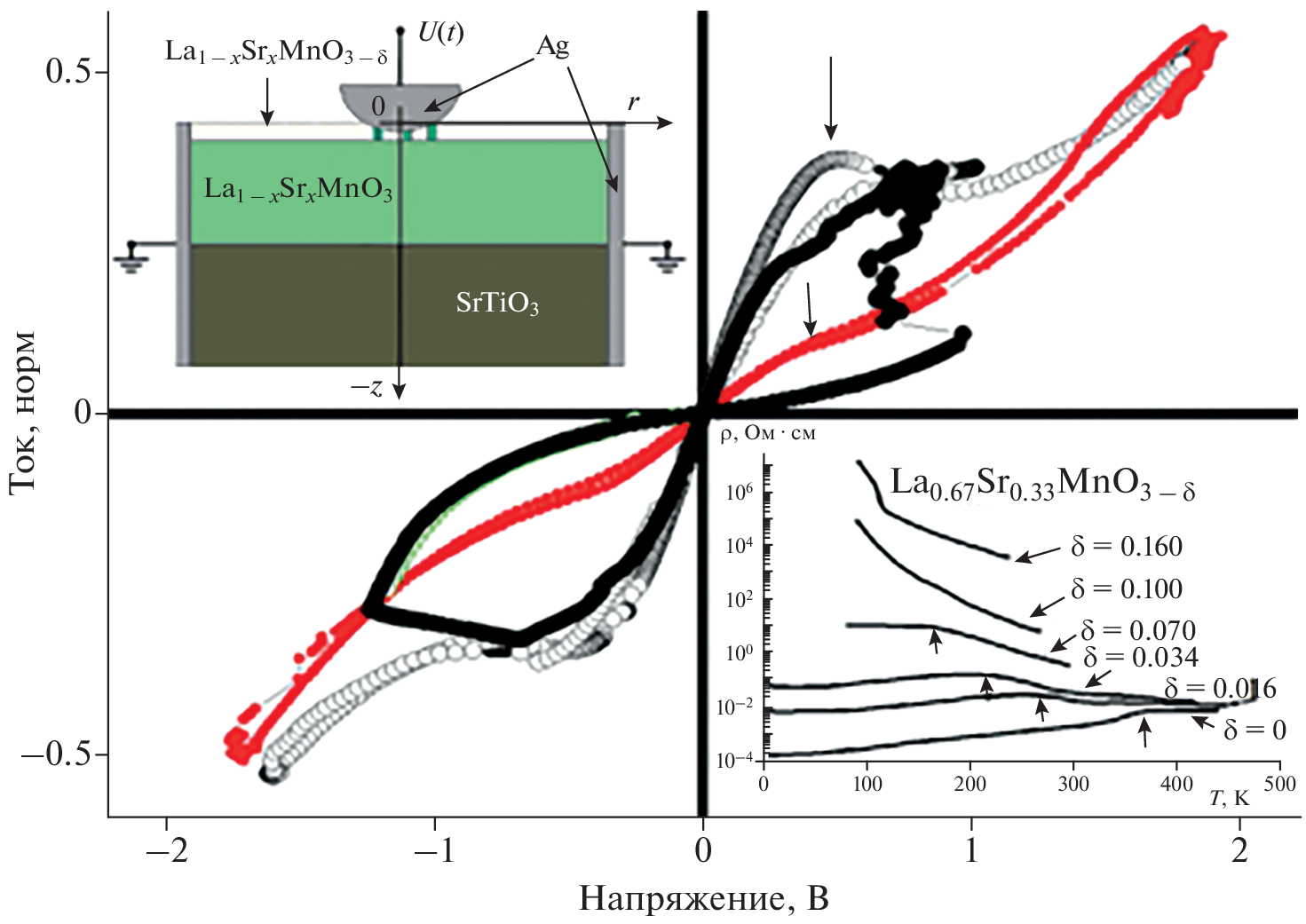 The choice of base materials and the use of their functional properties in the development of the structure and elucidation of the mechanism of resistive switching has been analyzed. Mesoscopic heterostructures based on epitaxial oriented 〈001〉 films of high-temperature superconductor YBa2Cu3O7 – δ and doped manganite La1 – xSrxMnO3 – δ, were obtained, and the properties of percolation channels of structures based on these compounds were studied. The effects of “self-adapting electroforming” in microcontact heterostructures based on epitaxial films of manganite are observed. Numerical calculations using the critical electric field model have shown that “self-electroforming” occurs in strong electric fields and a gap structure is formed in the contact zone. This structure provides reproducibility of resistive switching.