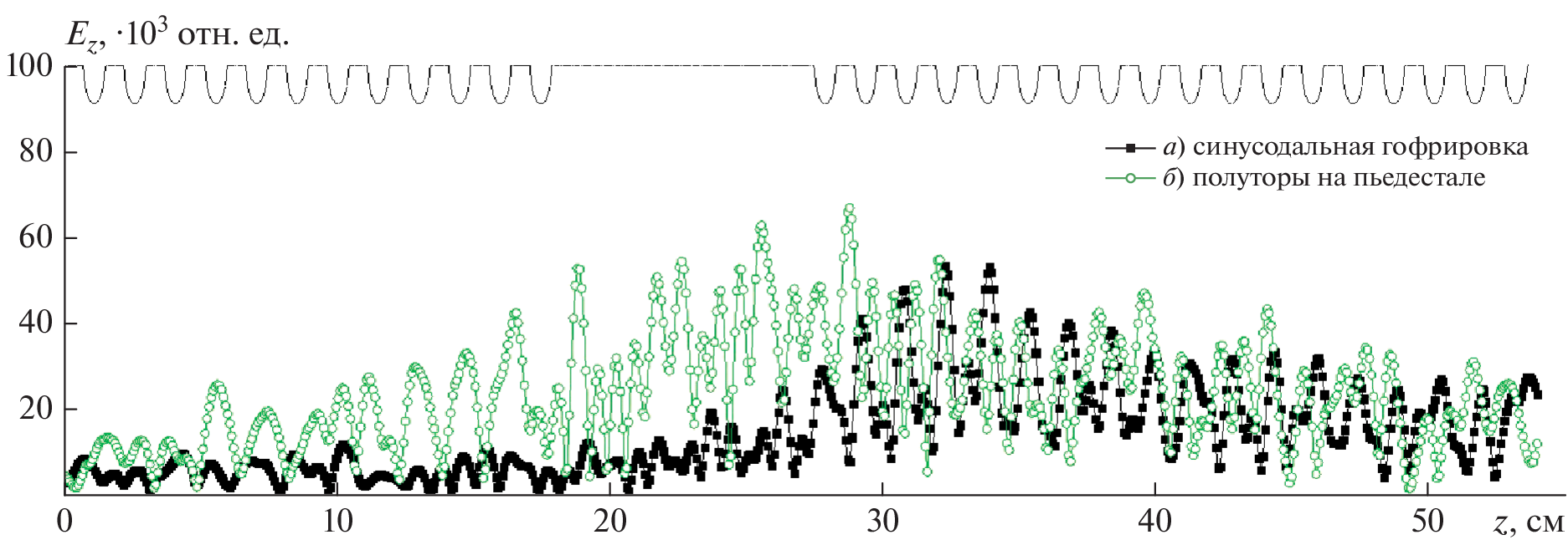 The effect of variation the length of drift tube of two-section structure of axisymmetric relativistic diffraction generator on its output power operation and sustainability of generation is considered. A comparison is made of the electromagnetic field strength distribution for structures with two types of discontinuity: sinusoidal corrugation and half-torus on pedestal.