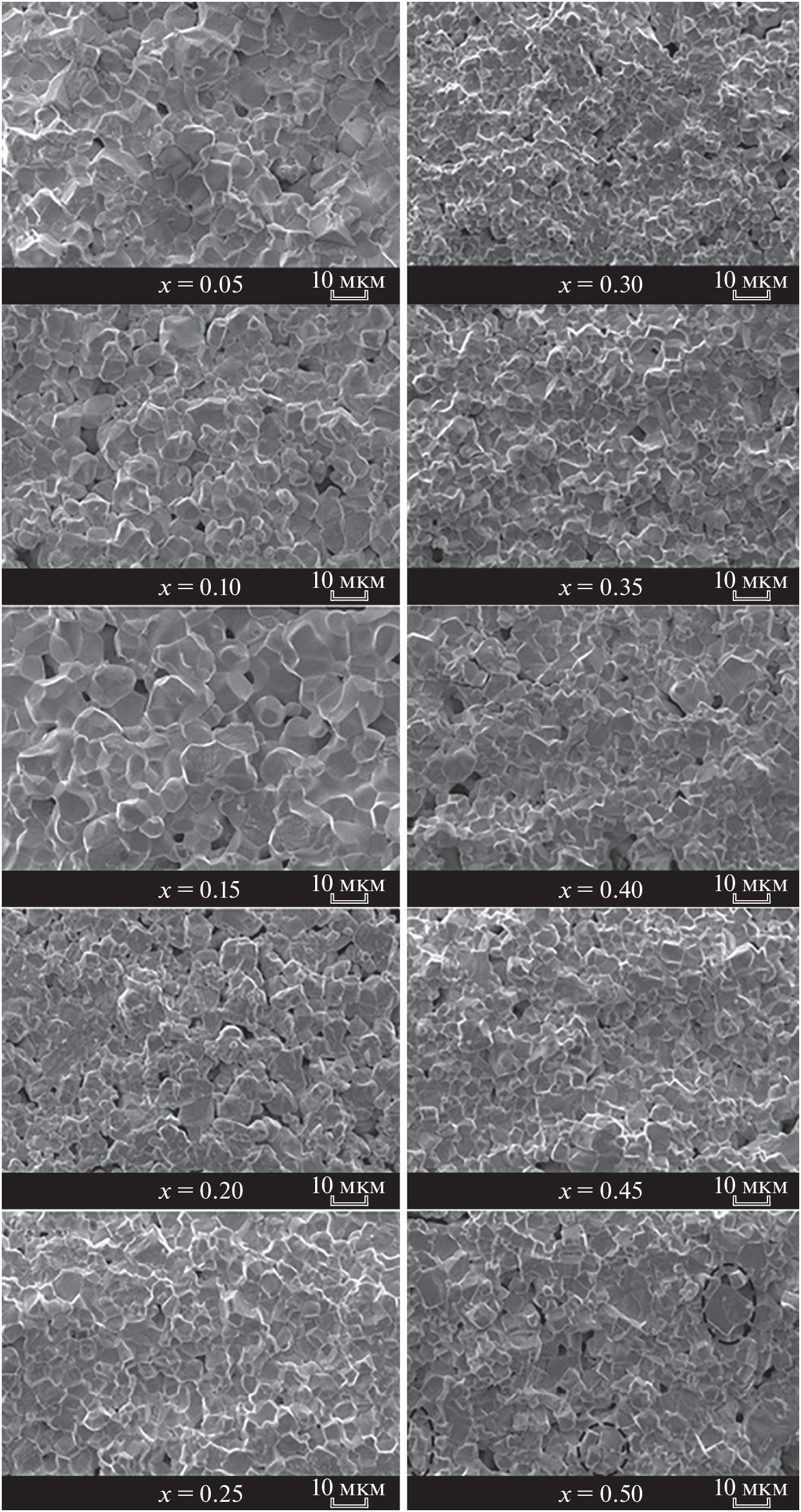 The solid solutions of the (1 – х)BiFeO3–x/2PbFe1/2Nb1/2O3–x/2PbFe2/3W1/3O3 system in the concentration range 0.05 ≤ х ≤ 0.50 were produced by solid state method and sintering using conventional ceramic technology. In the range 0.25 < x < 0.35, a morphotropic phase transition from the rhombohedral phase to the cubic phase was found. The difference in symmetry when “scaling” the material is shown. The influence of PbFe1/2Nb1/2O3 and PbFe2/3W1/3O3 on the grain structure formation was established.