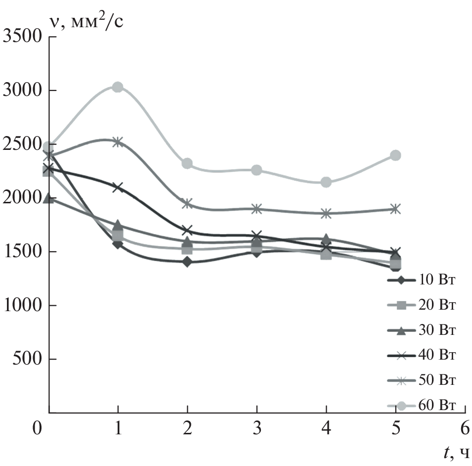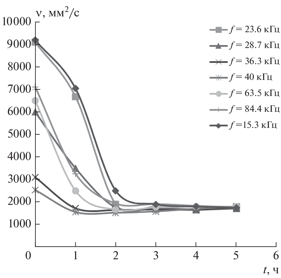 We studied the effect of high-intensity ultrasonic treatment on the rheological characteristics of high-molecular hydrocarbons. The dependences of the change in their kinematic viscosity on frequency in the range from 15 to 87 kHz are presented at a constant intensity and duration of ultrasonic exposure, as well as on the intensity of ultrasonic exposure at a constant frequency and duration. The processes of relaxation of the kinematic viscosity of these substances after ultrasonic treatment have been studied.