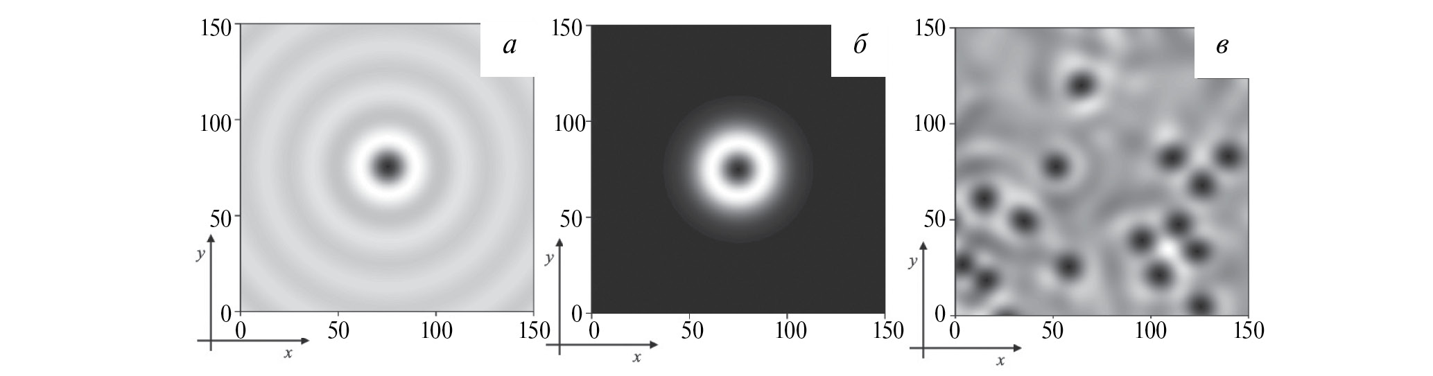 Рис. 2. Образующие пучки мультиплексных систем: пучок на основе краевой дислокации (а), цилиндрическая мода TEM01 (б), случайно расположенные дислокации (в).