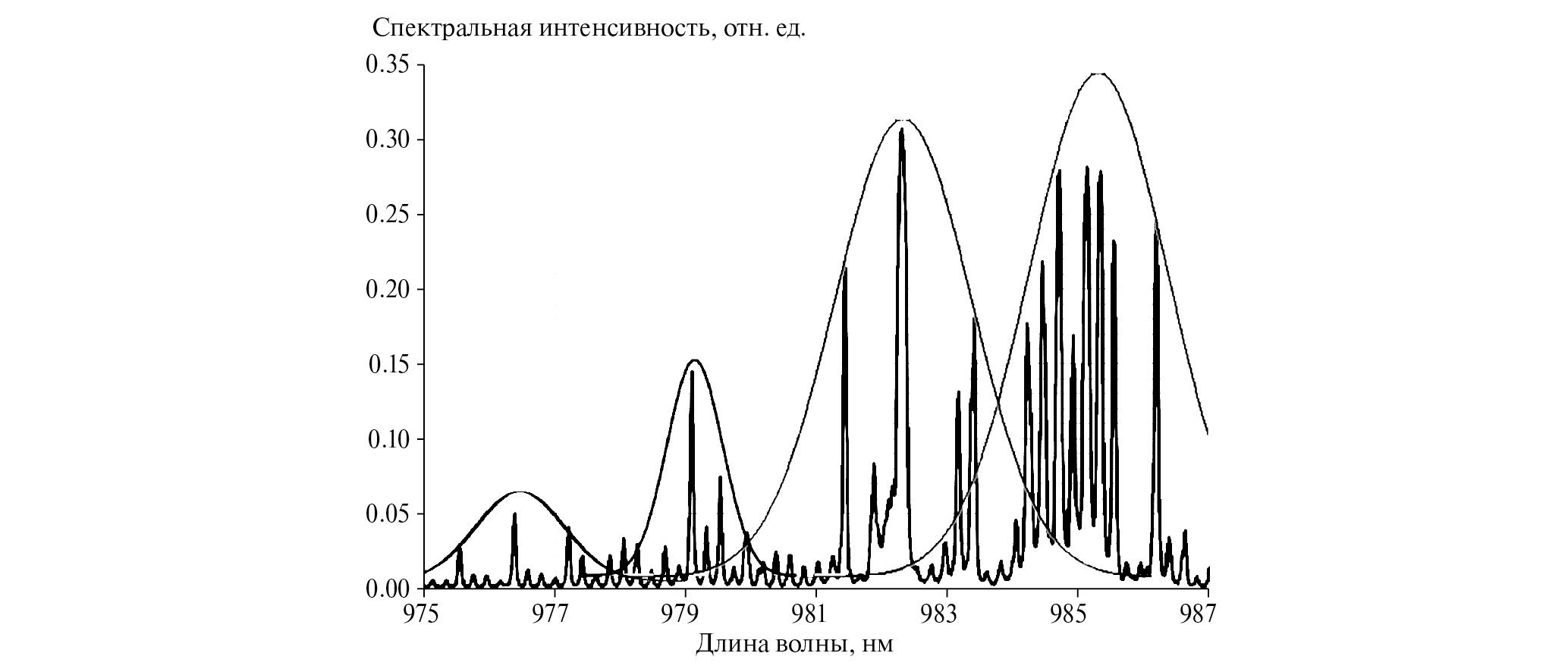 Процесс деградации МЛД рассмотрим на примере МЛД 129. На рис. 1 и 2 представлены спектры этого прибора до и после наработки. Видно, что спектр излучения МЛД 129 лежит в диапазоне, указанном в паспорте, — 980 ± 5 нм. В этом же диапазоне длин волн находится спектр излучения и остальных МЛД. Спектр в основном представляет собой эквидистантно расположенные линии, что характерно для резонатора Фабри-Перо. Это позволяет определить тонкую структуру спектра как структуру, состоящую из пиков продольных мод МЛД. В тонкой структуре наблюдаются группы продольных мод с пиками большой интенсивности. Огибающие таких групп пиков представляют собой элементы грубой структуры спектра МЛД, соответствующие разным пространственным каналам генерации, рассмотренным нами ранее в работах [5, 6]. В процессе деградации МЛД 129 наблюдаются два процесса: появление в грубом спектре двух новых огибающих групп пиков большой интенсивности и увеличение спектральной ширины линий продольных мод. На рис. 2 также видно, что внутри огибающих одновременно происходит уширение линий тонкой структуры спектра — резонансов продольных мод. Заметим, что общее число генерируемых продольных мод МЛД при деградации увеличивается и составляет для рассматриваемого лазера несколько десятков штук.