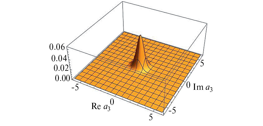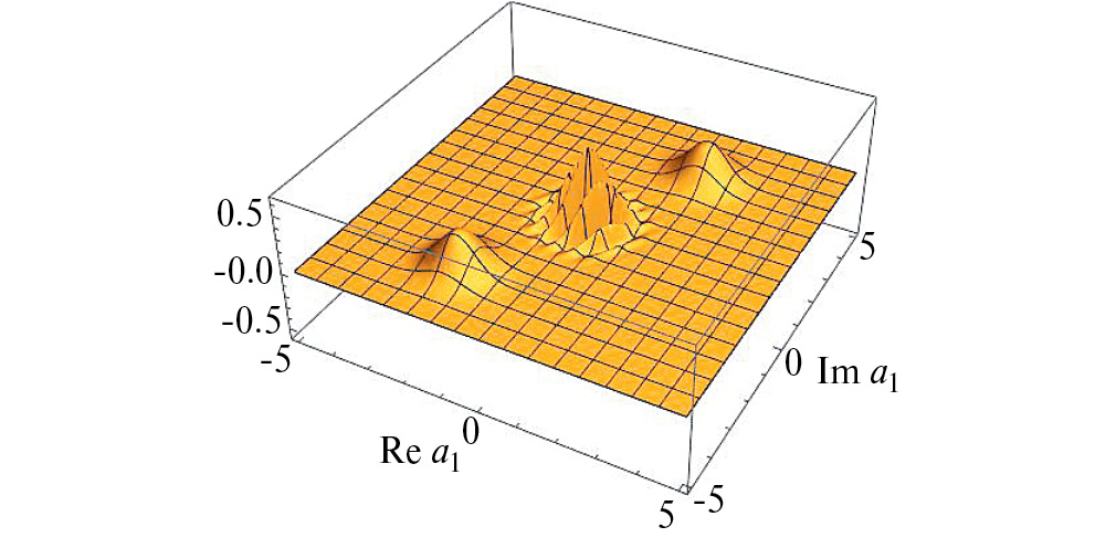 Обычно для нахождения фазового портрета состояния мод применяются функции квазираспределения Хусими, Глаубера-Сударшана и Вигнера [8–11]. Здесь мы используем функцию Вигнера, поскольку она не сингулярна и визуализирует тонкие квантовые эффекты, например, интерференцию макроскопических когерентных состояний, четных и нечетных. Для вычисления функции Вигнера найдем среднее значение квантовой характеристической функции [6, 7] в случае, когда моды и находятся в суперпозиции когерентных состояний и вакуумном состоянии при x = 0: