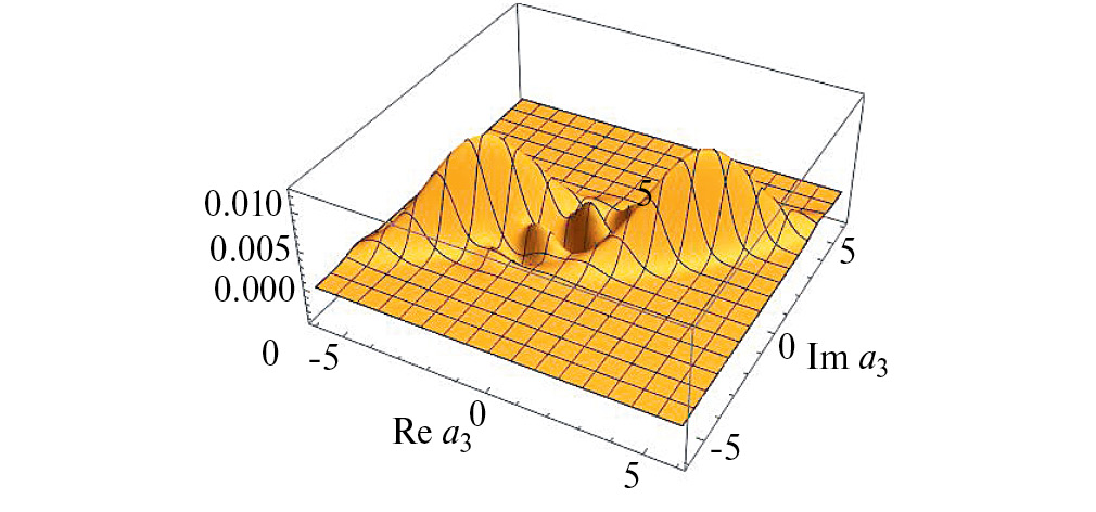 На рис. 1 показан квантовый фазовый портрет суперпозиции когерентных состояний моды при среднем числе фотонов и x = 0. На рис. 2 и рис. 3 представлены графики квантовых фазовых портретов состояния моды с использованием (6). Для сравнения на рис. 3 взята приведенная длина взаимодействия ξ = 0.9