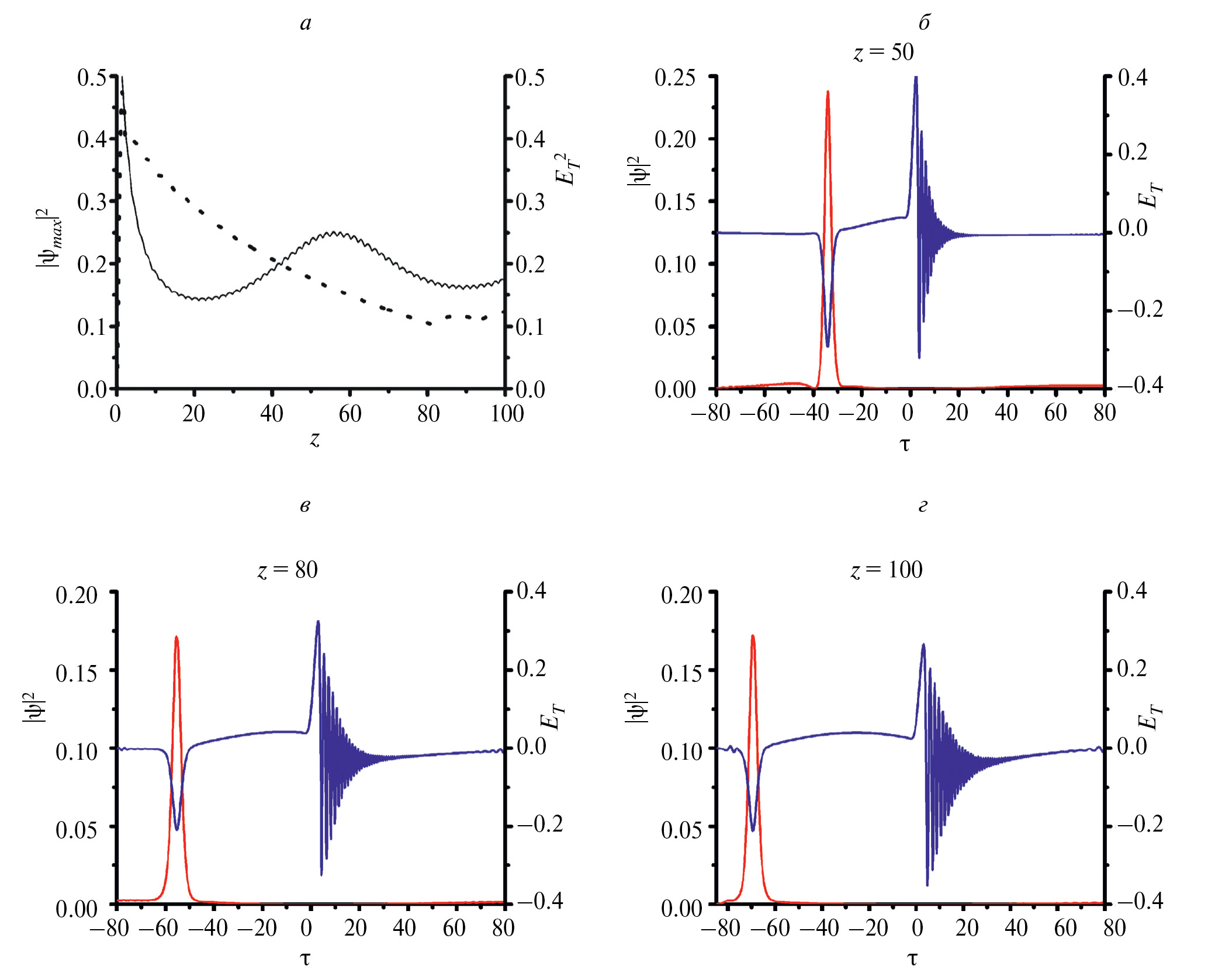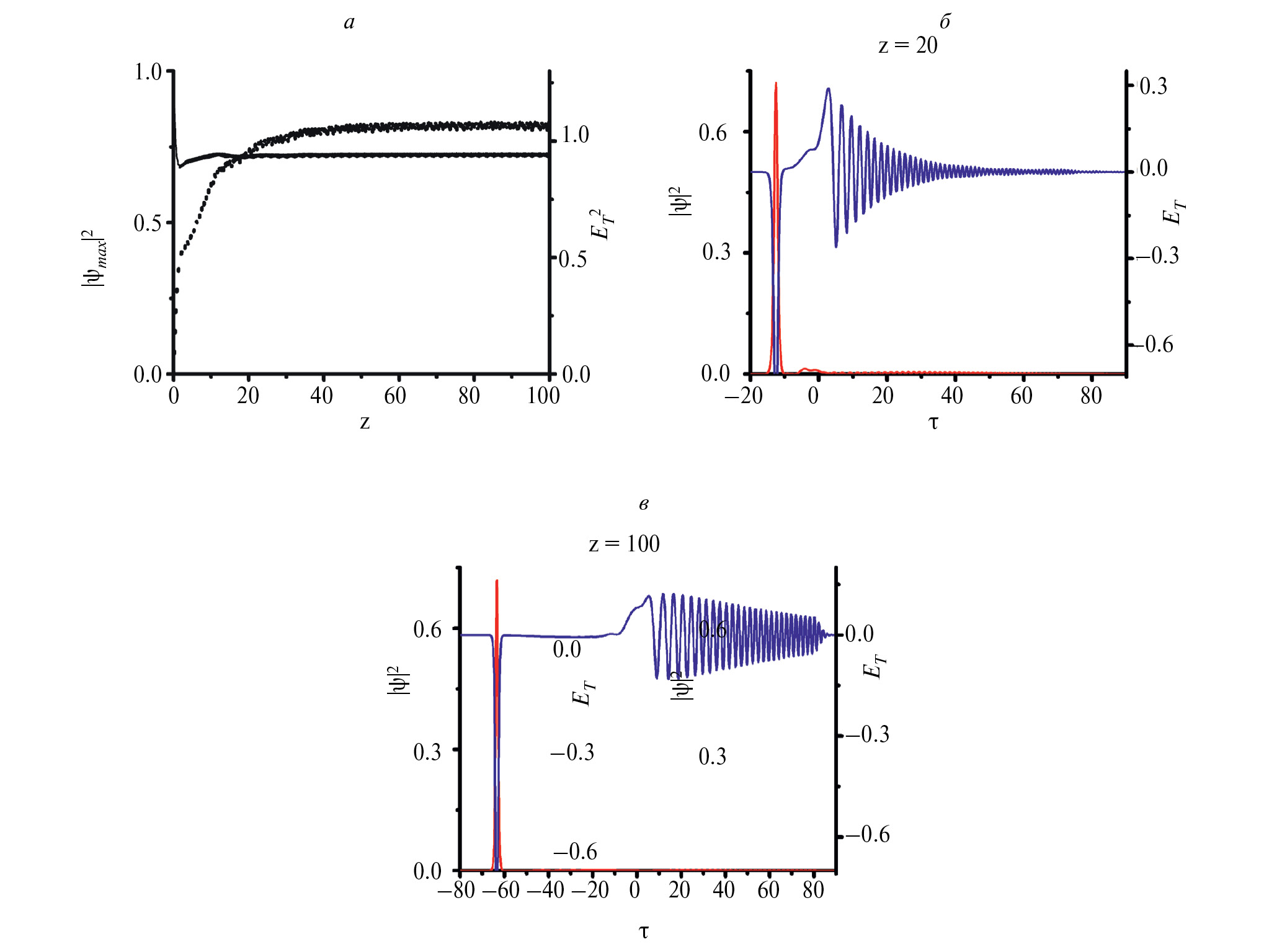 На рис. 4 приведены результаты расчета с параметрами, аналогичными рис. 3, за исключением наличия фокусирующей керровской нелинейности p = –1. Пиковая амплитуда оптического сигнала на рис. 4а сохраняется с расстояния z = 10. Это свидетельствует о том, что к расстоянию в 10 нелинейных длин уже формируется оптико-терагерцовый солитон, распространение которого прослежено до ста нелинейных длин (см. рис. 4б и 4в). Справа от этого солитона можно видеть оторвавшийся от солитона терагерцовый сигнал, постепенно меняющий свой профиль.