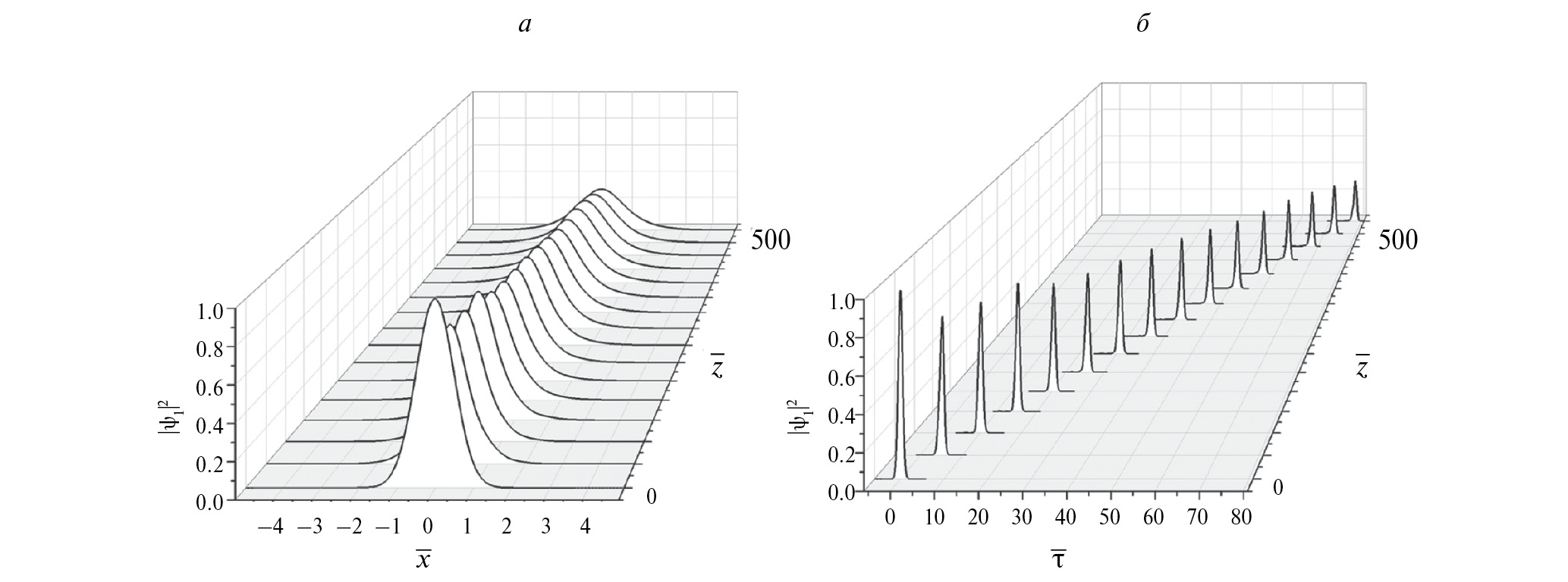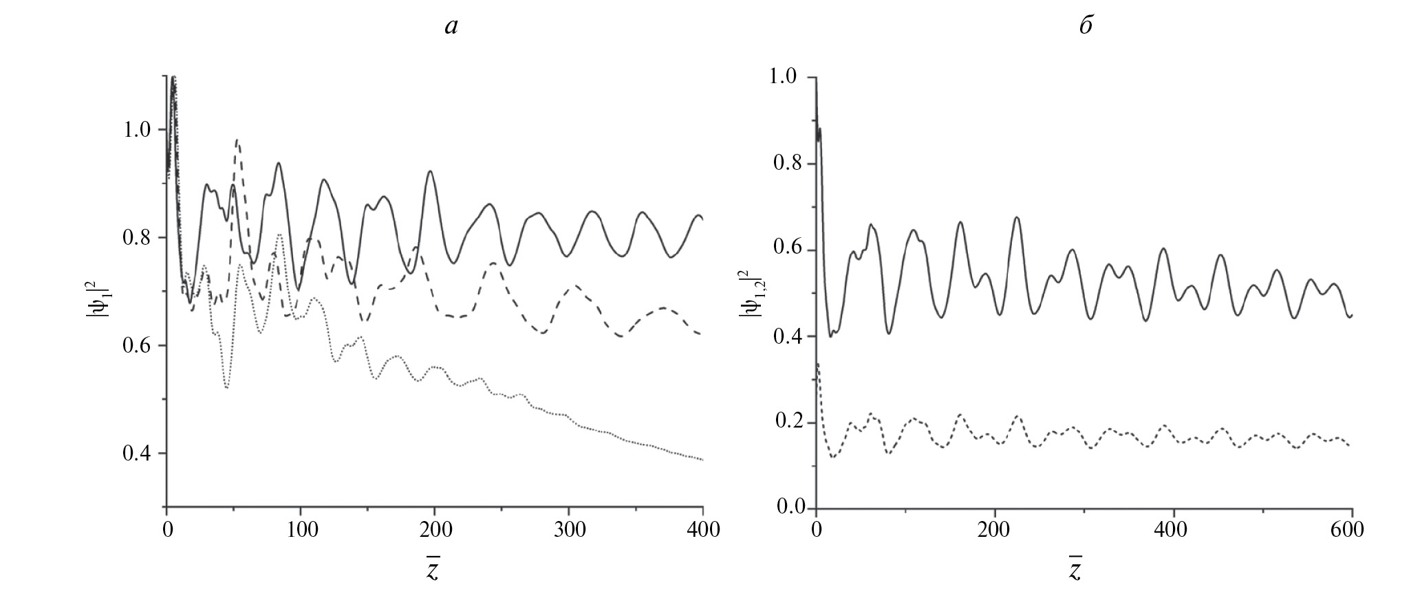 На рис. 2а приведены зависимости пиковых интенсивностей сигналов на основной частоте от продольной координаты при различных значениях N. Видно, что при N = 3 (короткий пунктир) устойчивый режим распространения световой пули нарушается. Увеличивая параметры Dβ1,2 (отвечающие за конкуренцию ДГС и нелинейности), мы возвращаем устойчивый режим (рис. 2б). Длительность сигнала сначала увеличивается, после осциллирует вокруг некоторого среднего значения, что свидетельствует о формировании СП. Отметим, что параметры такого солитона (амплитуда, длительность, ширина) будут отличаться от параметров той пули, которая получалась первоначально, до модификации параметров. Изменение параметров Dβ1,2 при постоянной входной длительности может осуществляться за счет изменения интенсивности импульса на входе в среду. При этом зафиксировать безразмерные коэффициенты дифракции Dβ1,2 можно путем изменения входной ширины импульса.