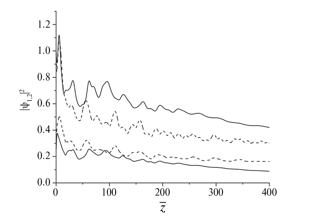Рис. 3. Зависимость пиковых интенсивностей сигналов на основной частоте и на второй гармонике (сплошные верхняя и нижняя линии соответственно) от продольной координаты при N = 3 Пунктирные верхняя и нижняя линии — пиковые интенсивности в случае нулевой ДГС на частоте второй гармоники