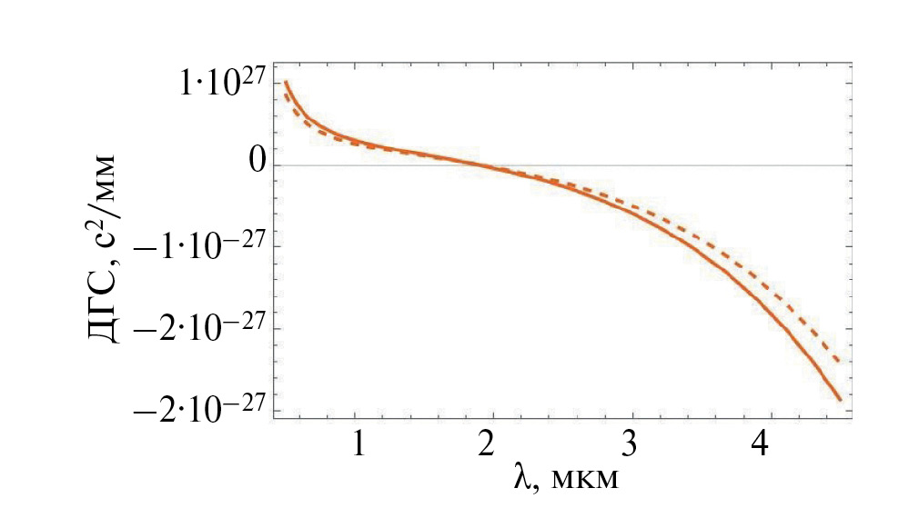 Необходимую для формирования СП отрицательную ДГС для некоторых кристаллов можно найти в инфракрасном диапазоне λ ≈ 1 мкм. Например, для кристаллов KDP и LiNbO3 ДГС в диапазоне прозрачности можно оценить по формуле Зельмейера [20]. Соответствующая иллюстрация приведена на рис. 4. Однако соотношение (3) между отрицательными коэффициентами ДГС возможно лишь в средах с пространственной дисперсией, например, в микродисперсных неоднородных средах [6, 7].