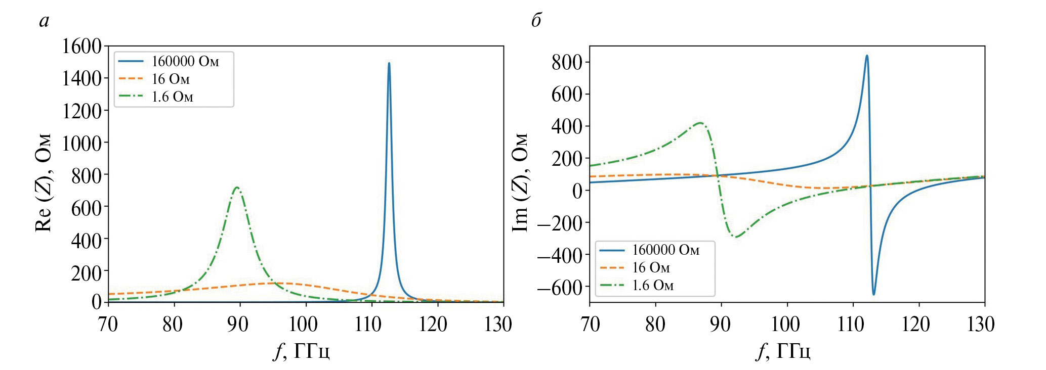 На рис. 2 приведены частотные зависимости действительной и мнимой частей эффективного импеданса структуры, соответствующие трем различным значениям дифференциального сопротивления pin-диодов: 1.6 Ом, 16 Ом и 160 кОм. Данные значения сопротивления были выбраны исходя из вольт-амперных характеристик коммерчески доступных кремниевых pin-диодов. На кривых, соответствующих крайним значениям сопротивления pin-диода на рис. 2а – 1.6 Ом (зеленый) и 160 кОм (синий), можно заметить выраженные резонансные пики на частотах 89 и 112 ГГц, соответственно. Обращение в ноль мнимой части импеданса системы в этих точках (рис. 2б) свидетельствует о выполнении условий резонанса, положение которого существенно сдвигается при изменении сопротивления pin-диода.