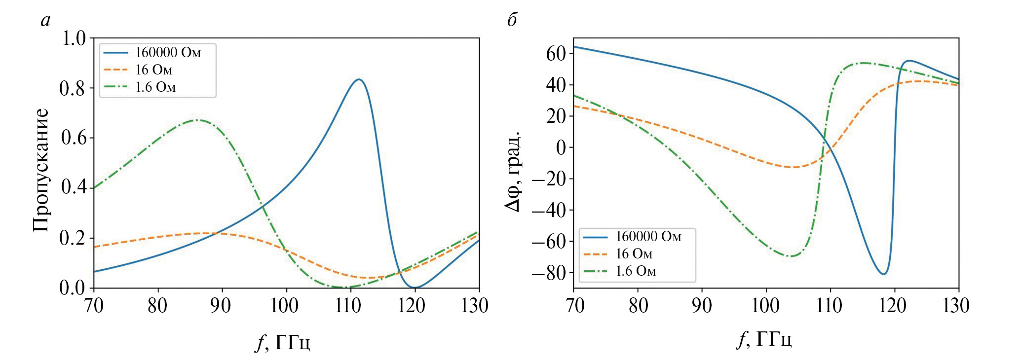 Частотные зависимости коэффициента пропускания и фазового сдвига в W-диапазоне, рассчитанные для различных сопротивлений pin-диодов, представлены на рис. 3. Вблизи резонансов, соответствующих крайним значениям сопротивления pin-диодов, наблюдаются максимумы коэффициента пропускания (рис. 3а) и отсутствие фазового сдвига (рис. 3б). Варьируя напряжение смещения на pin-диодах при фиксированной частоте, наибольшего фазового сдвига порядка Δφ ~ 90° удается достичь в диапазонах 95 – 105 ГГц и 115 – 118 ГГц. В соответствии с постановкой задачи оптимальное соотношение пропускания и сдвига фазы наблюдается вблизи рабочей частоты фазового элемента f = 96 ГГц.
