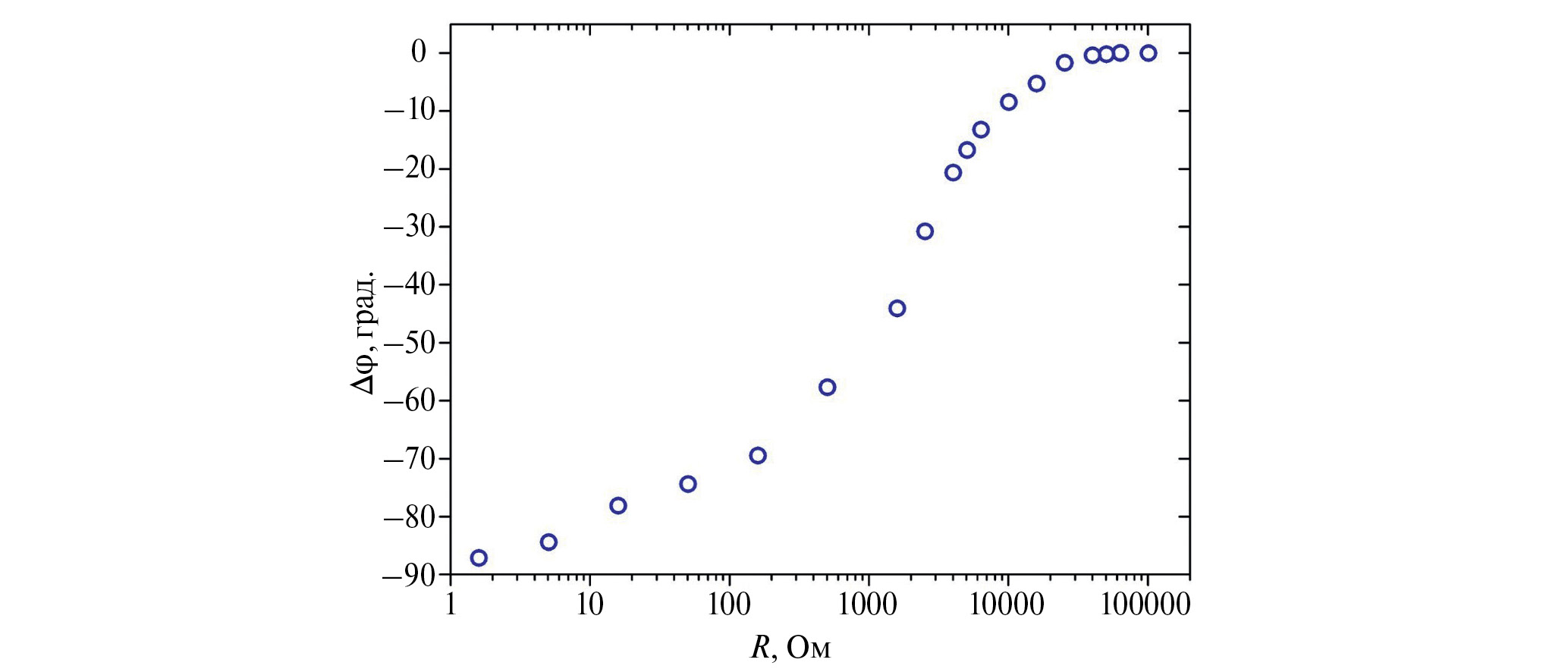 Важно отметить, что поворотом фазы в исследуемом фазовращателе можно управлять непрерывным образом, перестраивая дифференциальное сопротивление pin-диодов при помощи напряжения смещения. Зависимость сдвига фазы прошедшей волны для фиксированной частоты f = 96 ГГц от дифференциального сопротивления pin-диодов приведена на рис. 4.