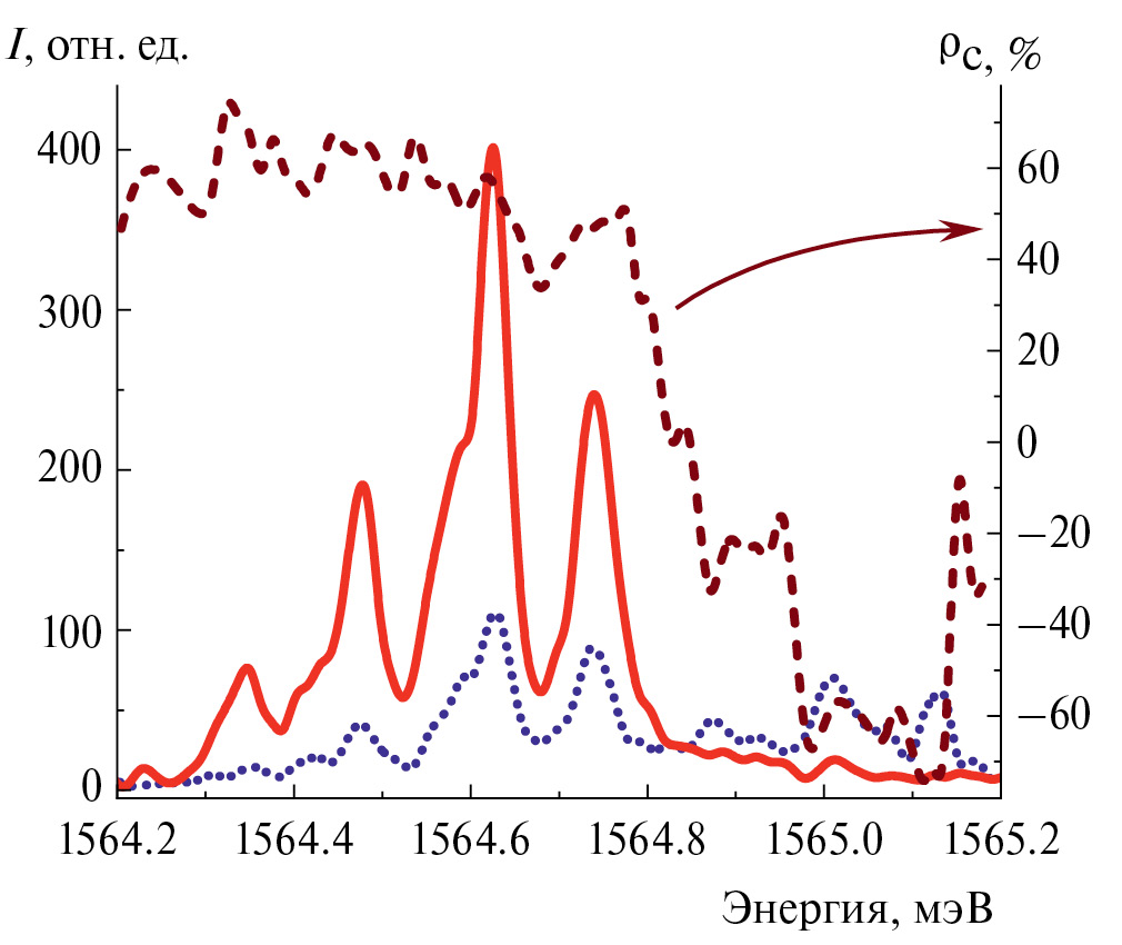 На рис. 1 показан пример спектров излучения, зарегистрированных с высоким спектральным разрешением, одной из лазерных структур в режиме развитой генерации при значении импульсного тока, текущего через образец J ≈ 25 мА. Спектр излучения в σ+ циркулярной поляризации показан сплошной кривой, а в σ– – точечной кривой. На рис. 1 показана также степень циркулярной поляризации (пунктирная кривая), которая определялась из соотношения ρC = (I + – I –)/(I + + I –), где I + и I – – интенсивности излучения в σ+ и σ– циркулярной поляризации, соответственно.
