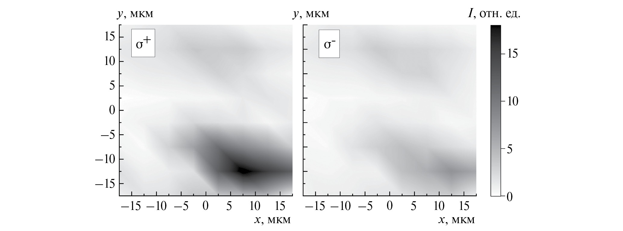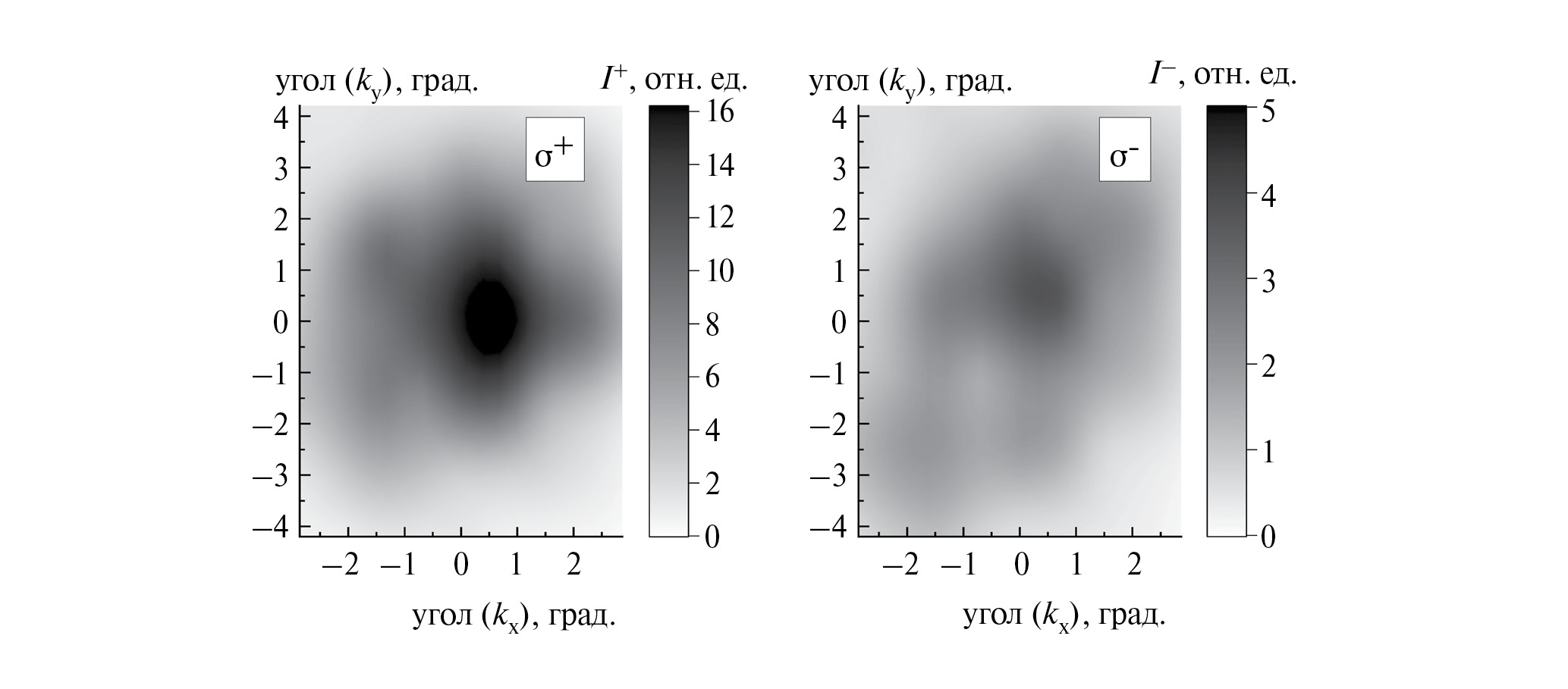 На рис. 3 (с использованием шкалы серого цвета) показаны двумерные зависимости интенсивностей моды с энергией излучения ~1564.62 мэВ в σ+ и σ – циркулярной поляризации (масштабы интенсивностей I + и I – различны) от угла выхода излучения по отношению к нормали к поверхности образца вдоль x и y направлений в пространстве. Картины распределения интенсивностей по углу, так же как пространственные распределения, для разных мод генерации лазера отличаются друг от друга. Типичные значения ширин углового распределения интенсивностей и отличий в расположении их максимумов для разных мод могут достигать порядка нескольких угловых градусов. При этом наибольшие отличия в расположении максимумов углового распределения интенсивностей наблюдается для мод с различным знаком степени циркулярной поляризации излучения.