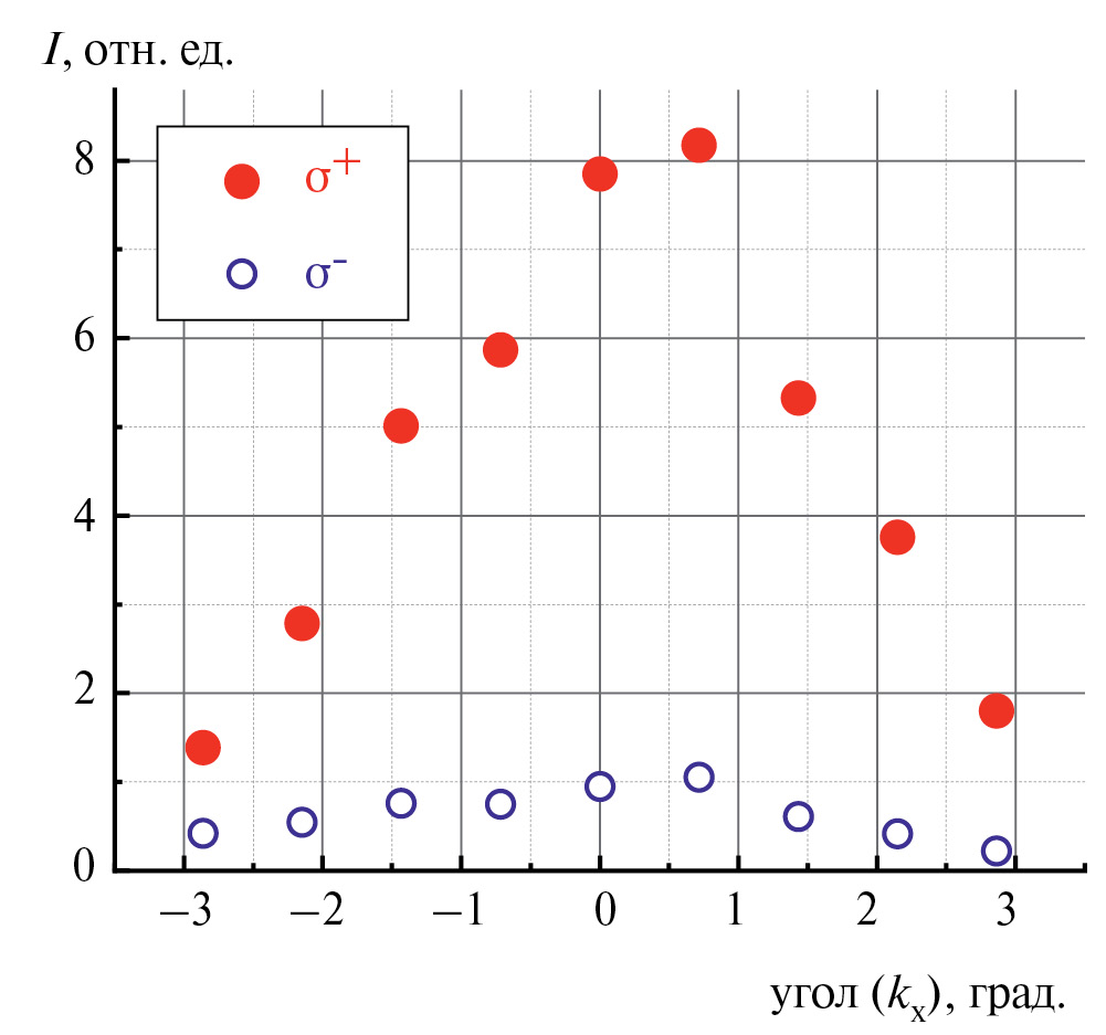 На рис. 4 представлен срез угловой зависимости интенсивности моды лазерной генерации, представленной на рис. 3, вдоль пространственного направления x (вблизи значения ky ≈ 0) в двух циркулярных поляризациях σ+ (закрытые символы) и σ– (открытые символы). Видно, что угловая расходимость Θ полосы генерации этой моды в дальней зоне составляет величину порядка несколько градусов, что, учитывая размер излучающей зоны Δl (рис. 2), неплохо согласуется с формулой для расходимости гауссова пучка Δl ≈ λ / π·Θ, где λ – длина волны излучения.