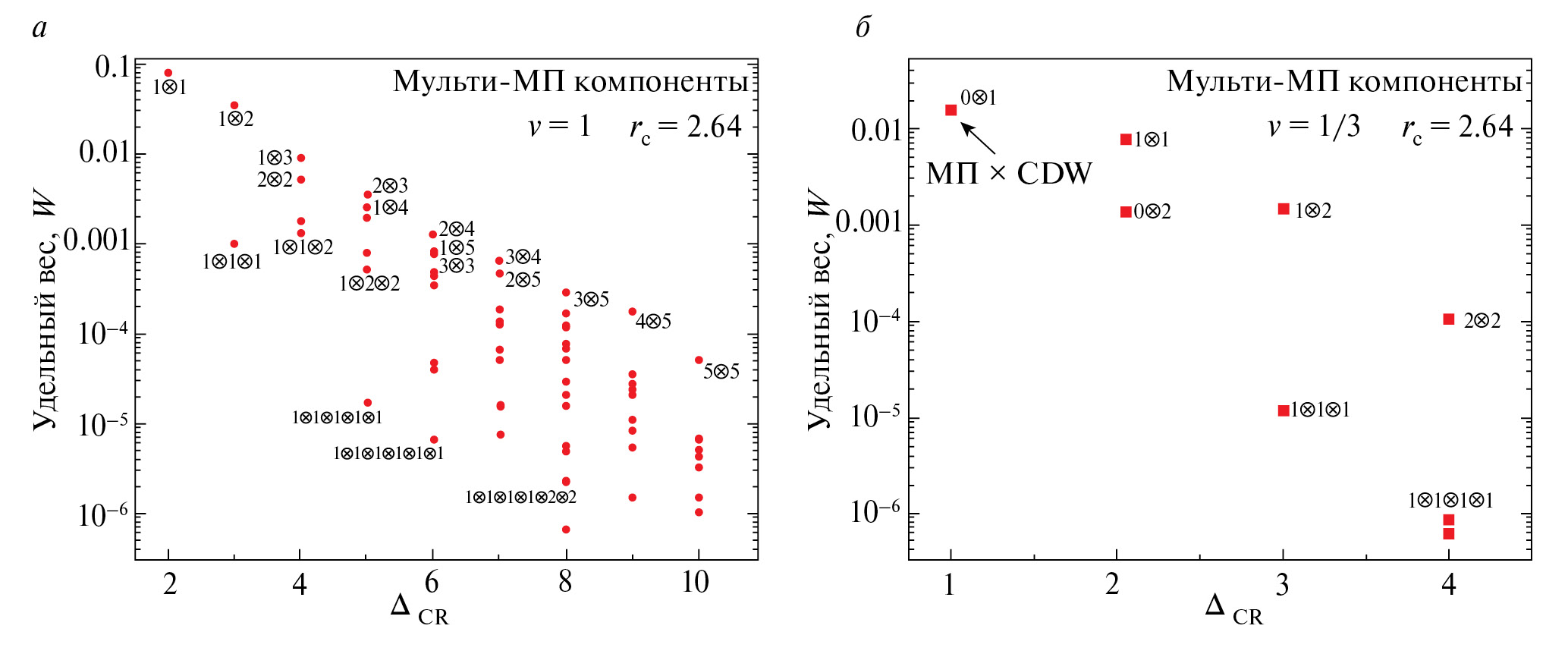 В состояниях дробного КЭХ имеется дополнительная степень свободы для внутриуровневых волн зарядовой плотности (CDW), которые могут спариваться с MП в структуре зарядовых флуктуаций. Это показано на примере основного состояния ν = 1/3, для которого в расчетной гистограмме лидирующий вклад дают флуктуации с ΔCR = 1, очевидно, состоящих из спаренных MП()×CDW() (соответствующая гистограмма показана на рис. 3б).