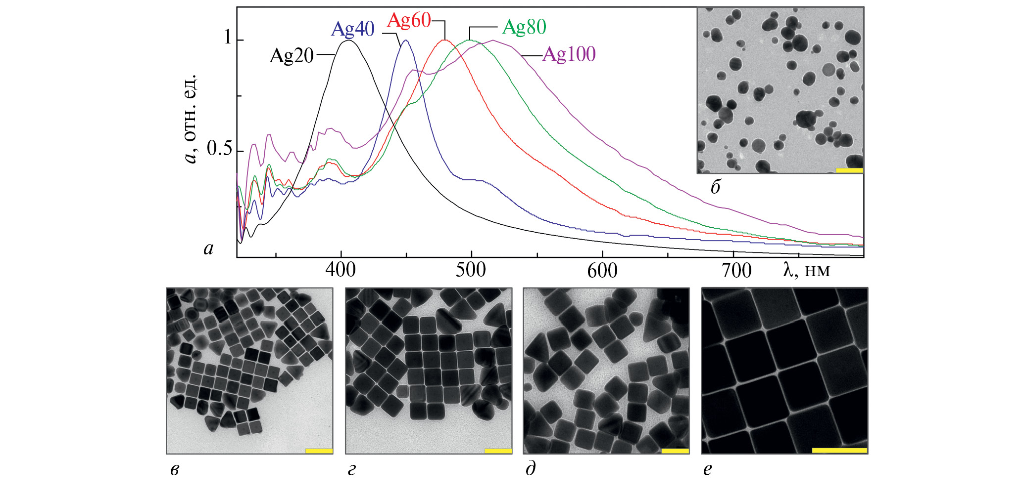 Рис. 2. Спектры экстинкции (а); типичные ПЭМ-изображения свежеприготовленных коллоидов Ag наночастиц с различными средними размерами: 20 (по методике Леопольда–Лендла [13, 21]) (б); 40 (в); 60 (г); 80 (д); 100 нм (е). Масштабные линейки составляют 100 нм