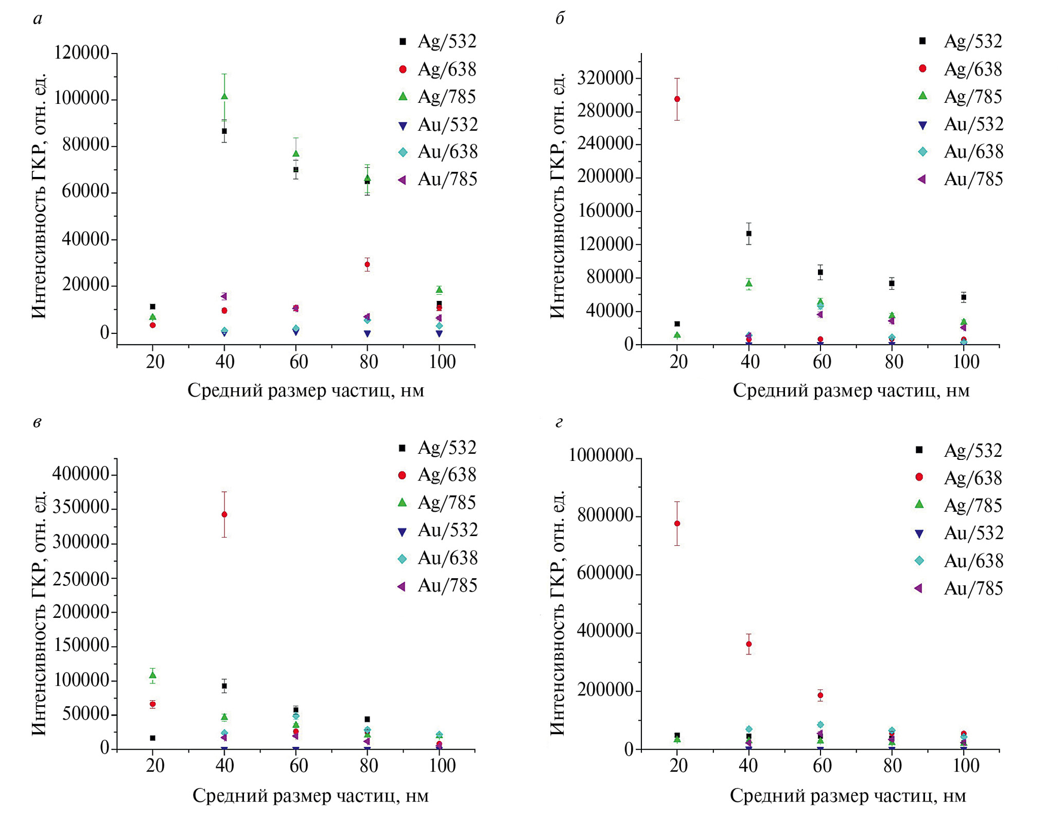 Из представленных данных видно, что максимум поглощения коллоидов зависит от среднего размера и материала частиц. Полученные результаты позволяют предположить, что на ГКР-подложках с серебряными частицами интенсивность сигнала будет выше при длине волны лазера, находящегося в зеленой области спектра (532 нм), а с золотыми в красной области спектра (638 и 785 нм).