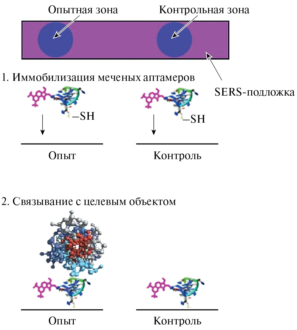 Представленные варианты иммунохимического анализа демонстрируют высокий потенциал SERS в экспресс-определении BoNT А. Вместе с тем, использование антител в таких детекторах имеет ряд ограничений, связанных трудоемкостью их получения. Сюда следует отнести синтез антигена для иммунизации, обеспечивающего хороший иммунный ответ и высокую аффинность антител, а также длительность наработки антител (1–6 месяцев). Мы предлагаем альтернативную систему специфического определения BoNT A с использованием аптамеров.