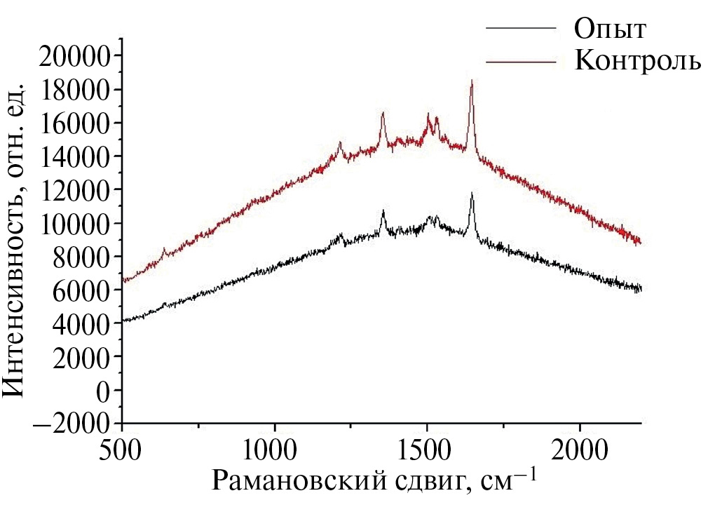 Рис. 8. Распределение интенсивности SERS опыта и контроля при определении BoNT A (2.4 нг/мл) с использованием раствора аптамеров к RSV с концентрацией 17.5 нМ