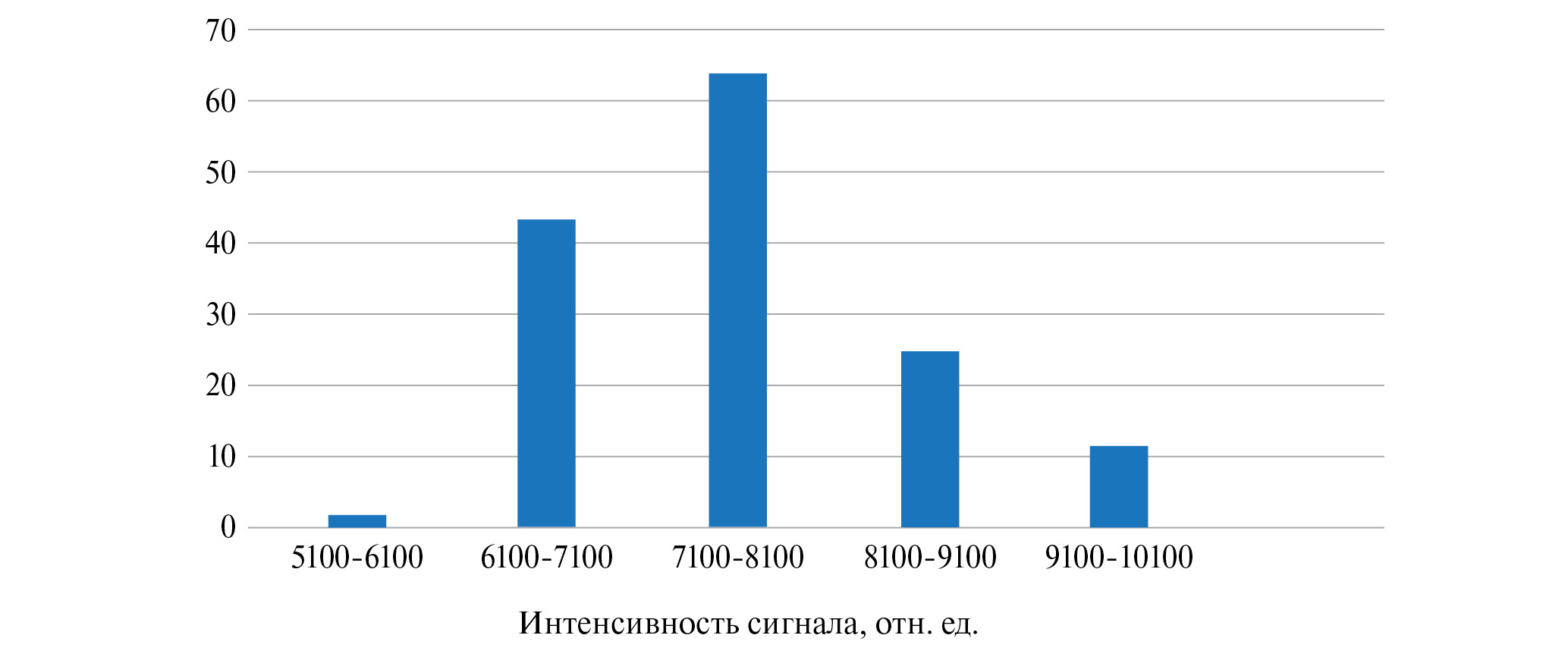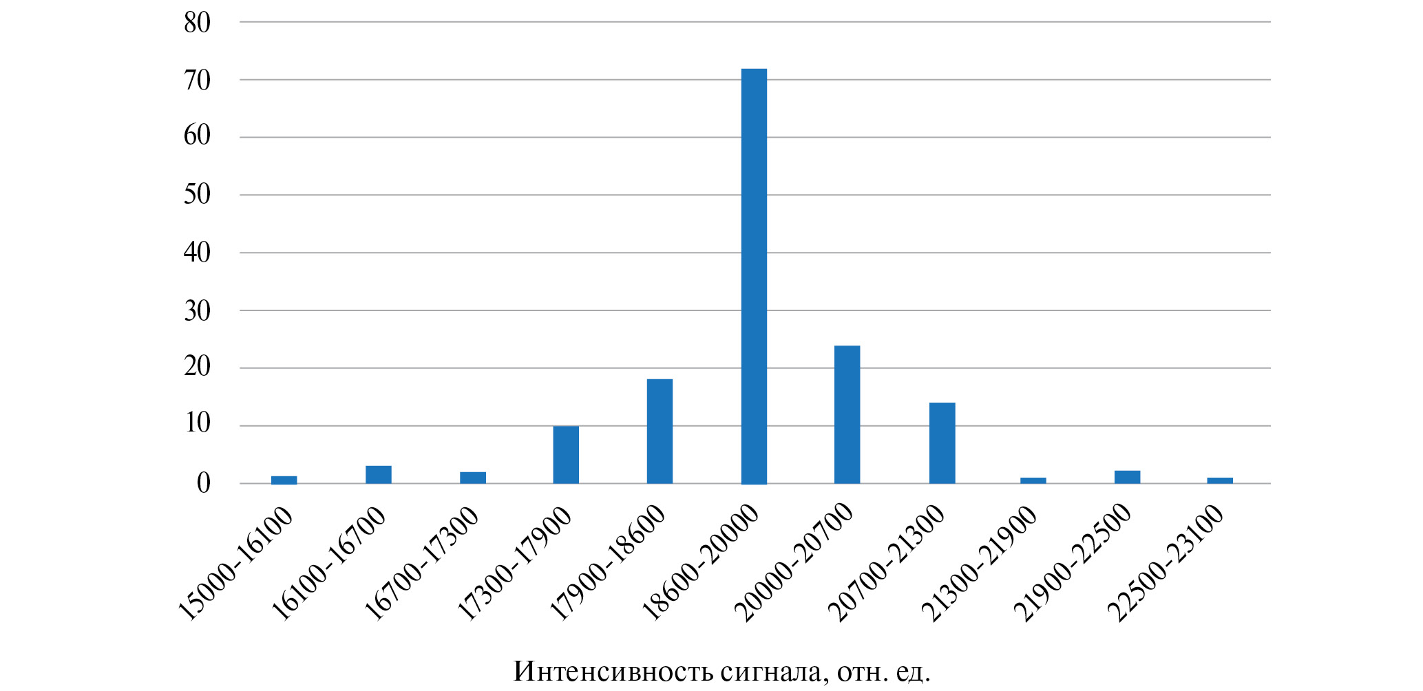 Нами были поставлены аналогичные опыты с IgGHum в качестве определяемого вещества. Этот белок был выбран по причине того, что его масса практически такая же, как и у BoNT A – 150 кДА. Кроме того, если рассматривать перспективу использования предложенного нами сенсора в клинической диагностике, этот белок будет одним из «мешающих» компонентов при анализе плазмы крови. Результаты определения представлены в табл. 3, из которых видно, что соотношение SERS-сигнала опытной и контрольных зон статистически равные. Это свидетельствует об отсутствии неспецифического связывания IgGHum и используемого аптамера. Распределение интенсивности сигналов опыта и контроля представлено на рис. 7.