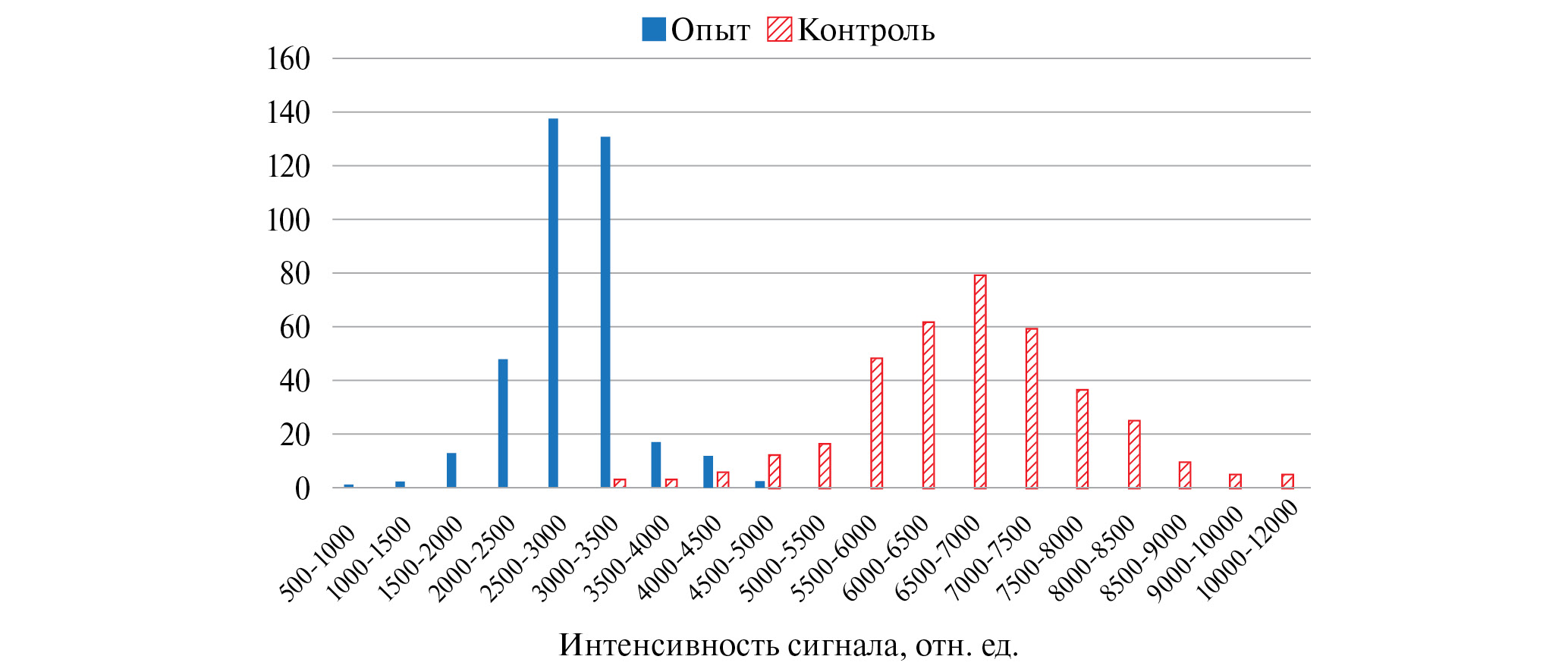 Рис. 6. Распределение интенсивности сигнала SERS опыта и контроля при определении BoNT A (2.4 нг/мл) с использованием раствора аптамеров с концентрацией 17.5 нМ на подложке