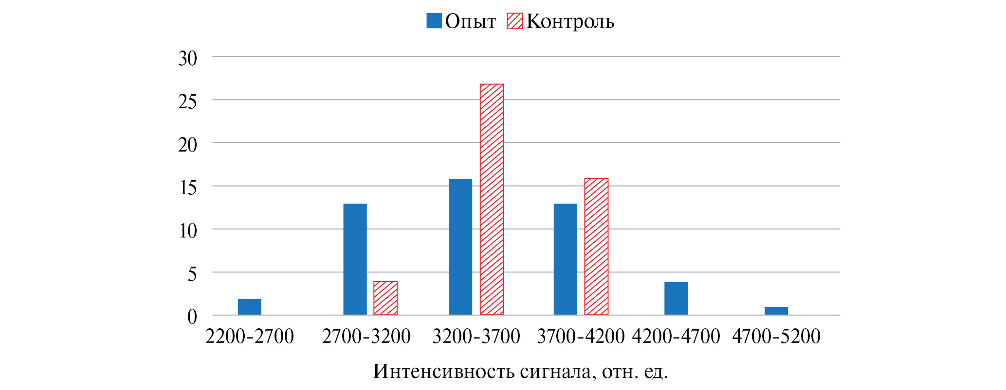 Рис. 7. Распределение интенсивности SERS опыта и контроля при определении IgGHum (24 нг/мл) с использованием раствора аптамеров к BoNT с концентрацией 17.5 нМ на подложке