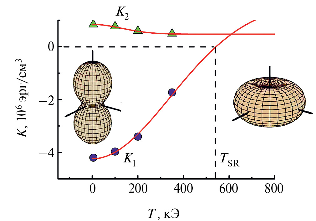 Рис. 3. Температурные зависимости констант магнитной анизотропии первого K1 и второго K2 порядков. Сплошные линии – аппроксимации, описанные в тексте. Вертикальной штриховой линией отмечена температура спонтанного спин-переориентационного перехода TSR. На вставках показаны схематические изображения эллипсоидов магнитной анизотропии, соответствующих анизотропии типа «легкая ось» (справа) и «легкая плоскость» (слева)