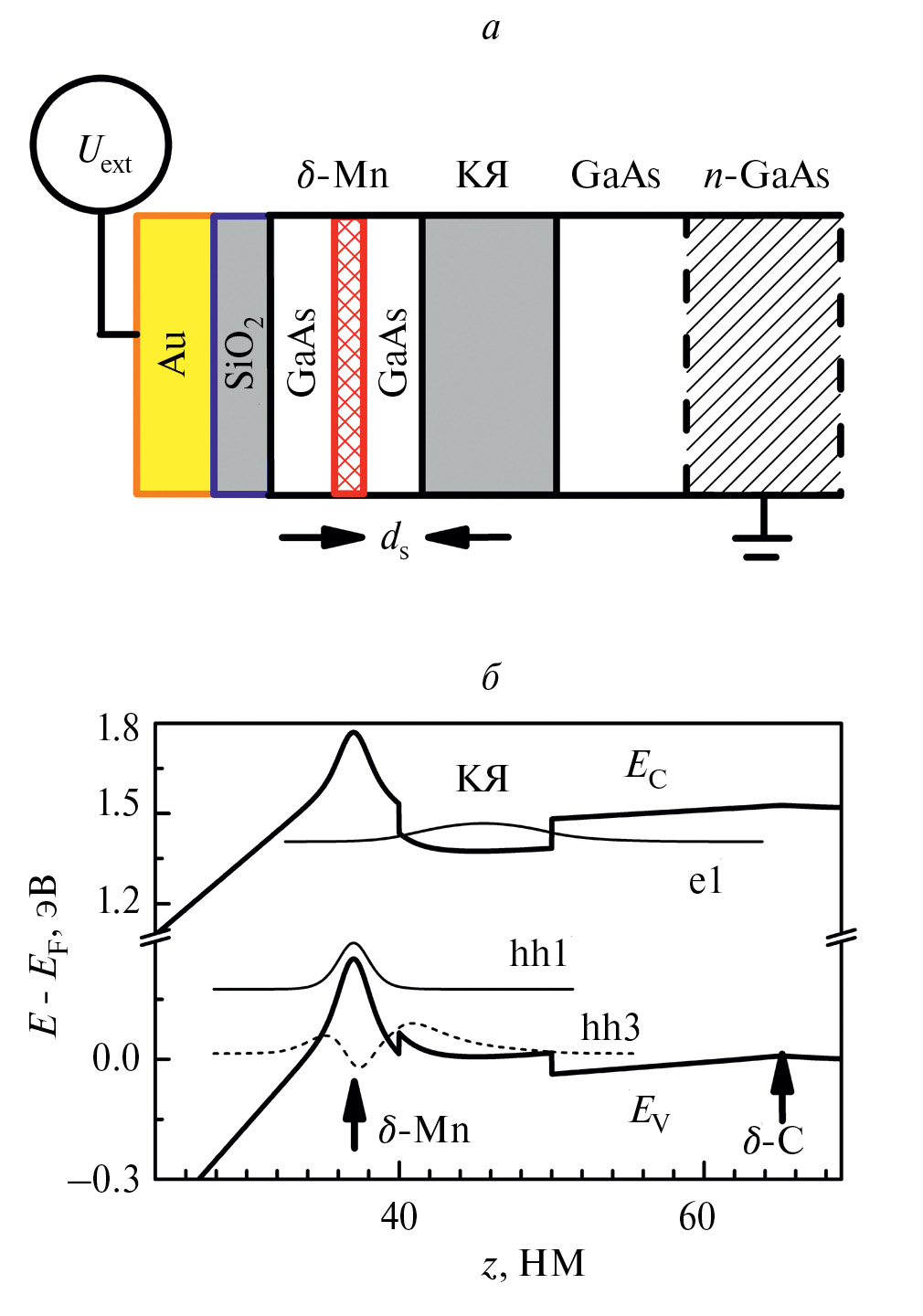 Рис. 1. Схема диодной структуры n-GaAs/InGaAs/GaAs/δ-Mn/GaA (а). Пример расчета зонной схемы структуры #1 с КЯ и отделенным от нее акцепторным δ-Mn-слоем высокой плотности (б) (детали см. в работе [11])
