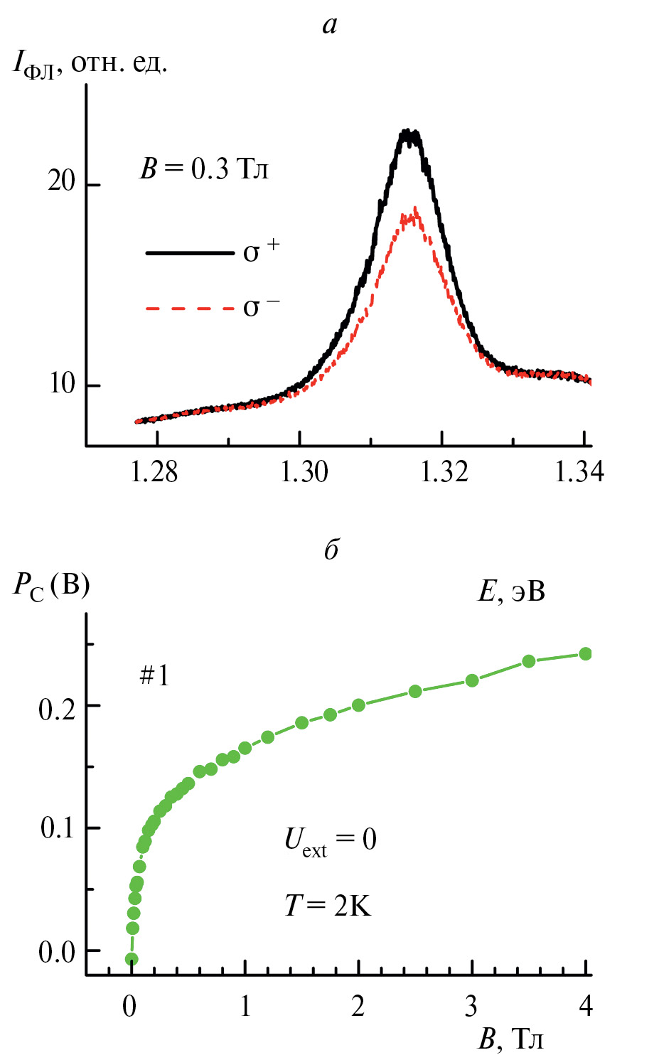 Рис. 2. Циркулярно-поляризованные спектры ФЛ структуры #1 при B = 0.3 Tл и внешнем электрическом напряжении Uext = 0, T = 2 K (а). Зависимость степени циркулярной поляризации PC(Uext) для линии КЯ структуры #1 при Uext = 0 и T = 2 K (б)