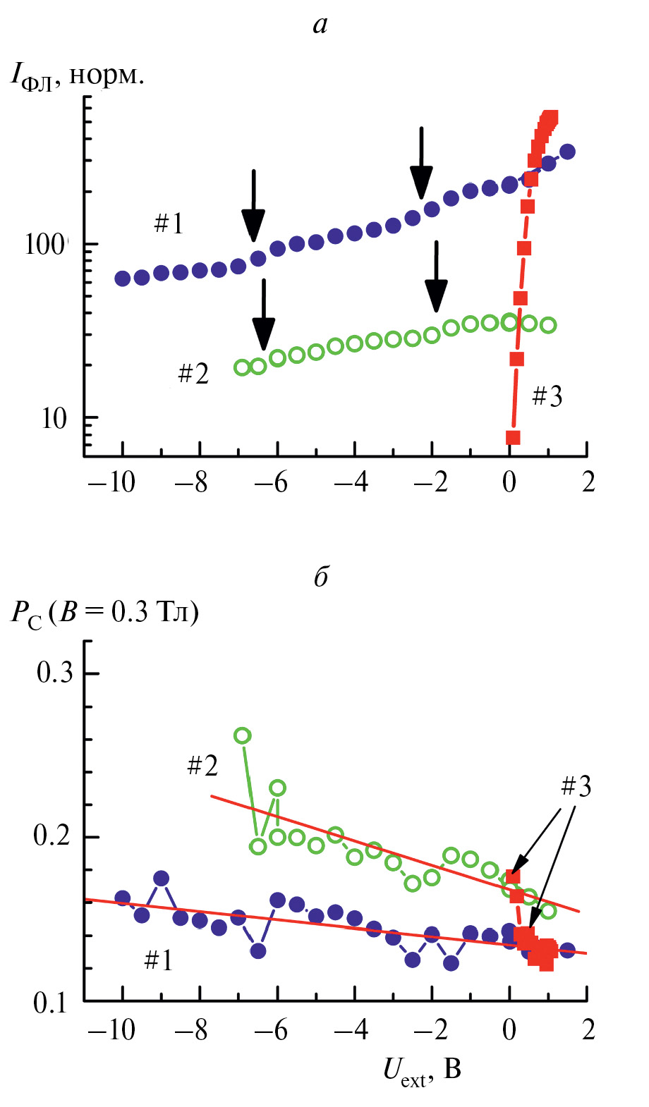 Поскольку внешнее электрическое напряжение непосредственно влияет на интенсивность и поляризацию ФЛ, изменяя перекрытия волновых функций электронов и дырок в КЯ [10], было исследовано влияние электрического напряжения на эти параметры излучения в структурах δ-Mn-слоем. На рис. 3 показаны зависимости интенсивности ФЛ IФЛ(Uext) и степени циркулярной поляризации PC(Uext) от внешнего электрического напряжения Uext для линии КЯ в поле B = 0.3 Tл. Из рис. 3a видно, что интенсивность IФЛ(Uext) во всех структурах монотонно растет с ростом Uext, при этом наиболее сильный рост происходит в структуре #3 с контактом Шоттки. Зависимости поляризации от Uext в целом демонстрируют также монотонное поведение – падение PC(Uext) с ростом Uext (линейная аппроксимация на рис. 3б). Например, в структуре #2 поляризация падает от PC ~ 0.25 до ~ 0.16 при изменении Uext от – 7 до + 1.5 вольт. При Uext > 1.5 в этих структурах происходит инжекция дырок и возникает электролюминесценция [9]. Электрическое напряжение при измерениях ограничивалось так, чтобы протекающий ток не превышал значения 30 мА во избежание пережигания диода.