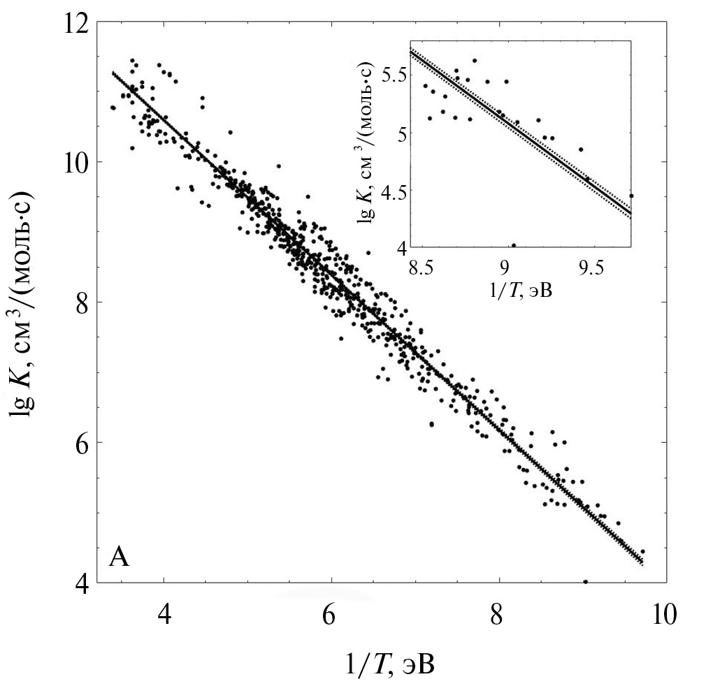 Однако при этом остается неясным, с какой точностью получены коэффициенты формулы Аррениуса. Во многих случаях для аппроксимирующей кривой (1) приводят экспертную оценку доверительного коридора. Как правило, он составляет ± (0.3 – 0.5) для lgK, т.е. истинное значение K до 2–3 раз больше либо меньше приведенного в сборнике.