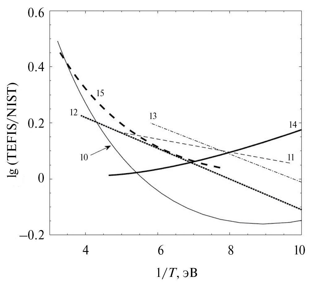На рис. 2 приведен десятичный логарифм отношения нашей аппроксимации к нескольким широкодиапазонным аппроксимациям [10–15] из базы NIST. Видно, что уклонение последних достигает от 0.2 до 0.5 для lgK, т.е. формулы для K(T) из NIST от 1.6 до 3 раз больше либо меньше нашей аппроксимации. Такое расхождение согласуется с оценками точности, приведенными в базе NIST. Таким образом, наша кривая в 60200 раз точнее ранее известных аппроксимаций.