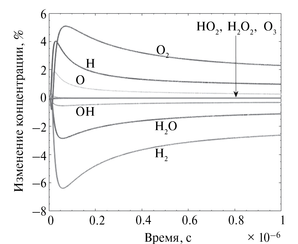 На рис. 3 показана зависимость важнейших компонент от времени при указанных условиях. Начальные концентрации соответствуют «гремучей смеси»: 2 части H2 на 1 часть O2. Расчеты проводились с использованием пакета GACK [19] с автоматическим формированием правых частей и контролем фактической точности в ходе расчета. Видно, что концентрации исходных компонент монотонно убывают. Конечным продуктом является вода, концентрация которой возрастает. Математическая точность расчета была не хуже 1%.