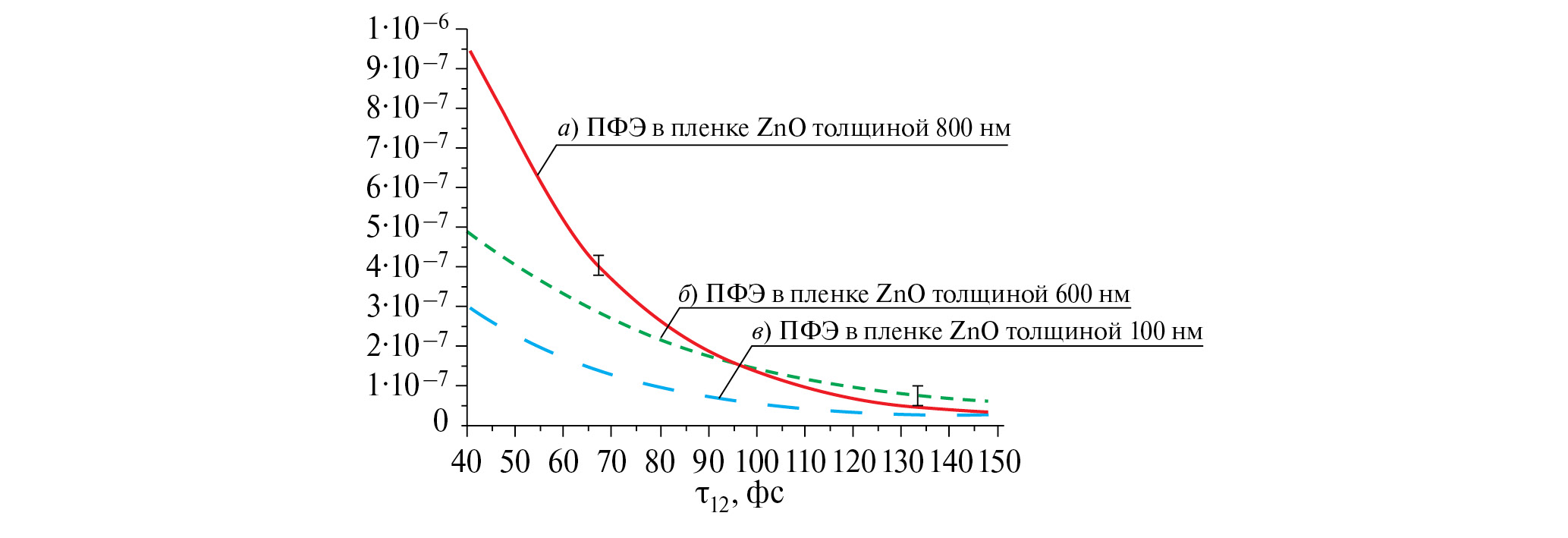 Особенностью возбуждения фотонного эха в тонких пленках оксида цинка, как было указано выше, является применение в качестве резонансного излучения фемтосекундных импульсов на длине волны 800 нм при условия отсутствии у активной среды переходов на длинах волн, больших 400 нм, в том числе и на длине волны 800 нм. Наличие двухфотонного поглощения лазерного излучения на длине волны 800 нм проверялось регистрацией сигналов ПФЭ в направлении пространственного синхронизма, соответствующего режиму двухфотонного поглощения. Для обеспечения этого режима необходимо точное соблюдение согласованности параметров двух фотонов, объединяющихся в один возбуждающий фотон. Условиям двухфотонного поглощения на квантовом переходе с длиной волны 400 нм соответствовало порядка 0.1% энергии лазерного импульса, подаваемого на длине волны 800 нм. Для точной юстировки нулевой задержки между возбуждающими импульсами вместо резонансной среды устанавливался нелинейный кристалл, в котором при нулевой задержке происходила неколлинеарная генерация второй гармоники.