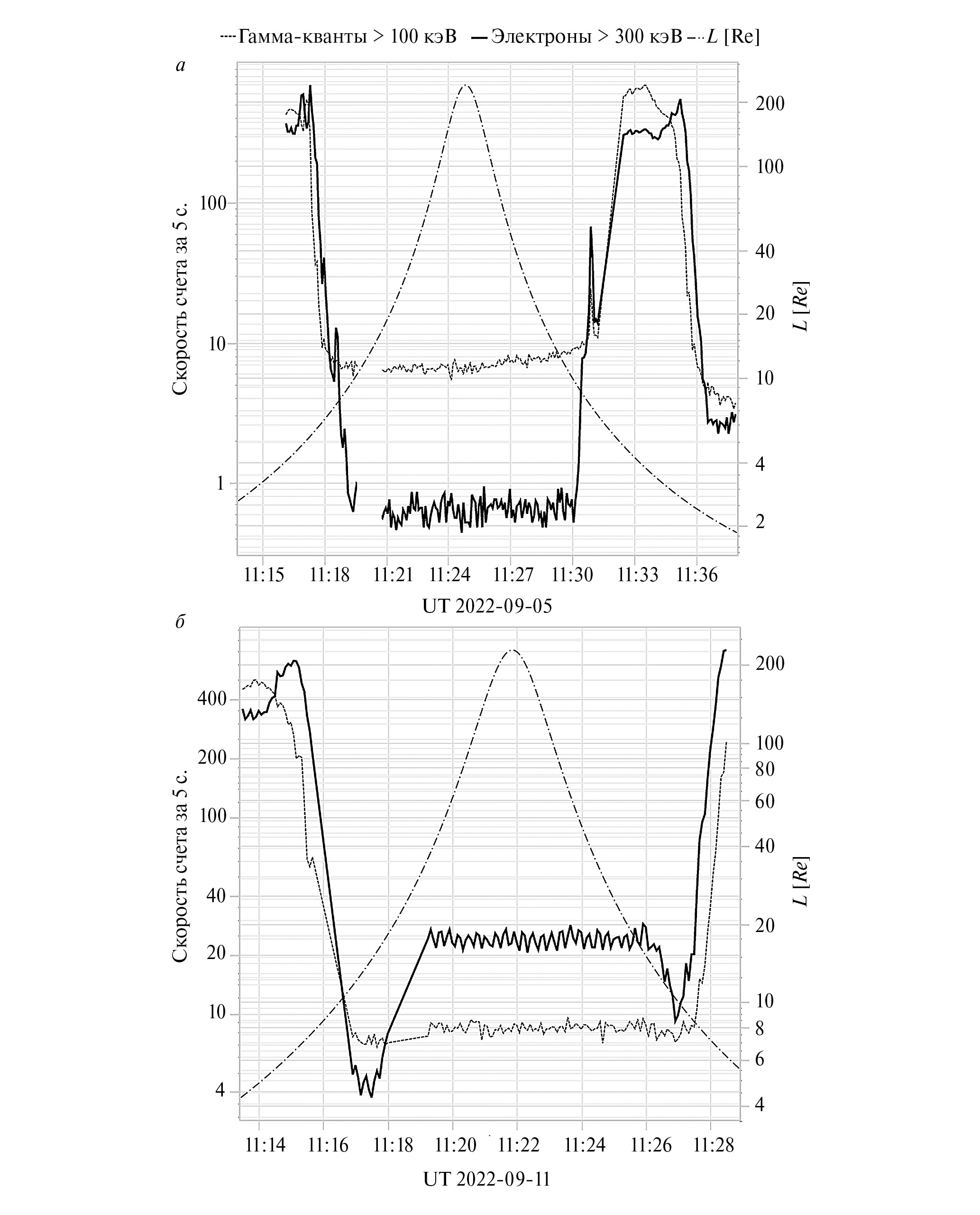 На рис. 1 представлен временной ход потоков гамма-квантов с энергией >100 кэВ (серые точки) и электронов с энергией >300 кэВ (черная сплошная линия), зарегистрированных прибором ДеКоР на кубсате ВДНХ-80 5 сентября (а) и 11 сентября (б), то есть до и после прихода СКЛ в сентябре 2022 г. Штрих-пунктирная линия на всех панелях показывает зависимость параметра Мак-Илвайна L от времени. Из рисунка видно, что после вспышки поток электронов СКЛ вырос примерно в 30–40 раз, тогда как поток гамма-квантов остался неизменным. На рис. 2 показан результат сопоставления временного профиля потоков электронов с энергией 175–315 кэВ по данным ИСЗ АСЕ (черные точки), находящегося в точке либрации (L1) и интегральных потоков электронов с энергией >300 кэВ, измеренных прибором ДеКоР на кубсате ДЕКАРТ в северной (черные кресты) и южной (серые ромбы) полярных шапках. Из рисунка видно, что данные АСЕ и ДЕКАРТ хорошо согласуются.