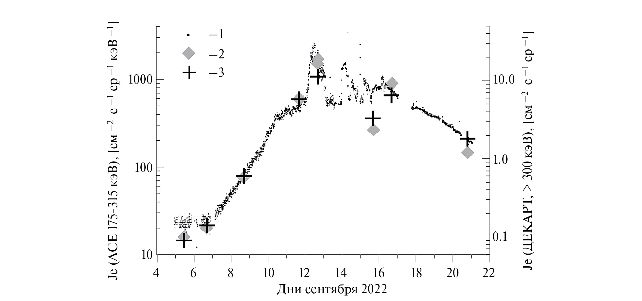 Рис. 2. Профиль события, наблюдавшегося в солнечных космических лучах в сентябре 2022 г. на спутнике ACE (черные точки (1), электроны с энергией 175‒315 кэВ), и на кубсате ДЕКАРТ (измерения проводились в северной (кресты) и южной (ромбы) полярных шапках, электроны с энергиями > 300 кэВ)