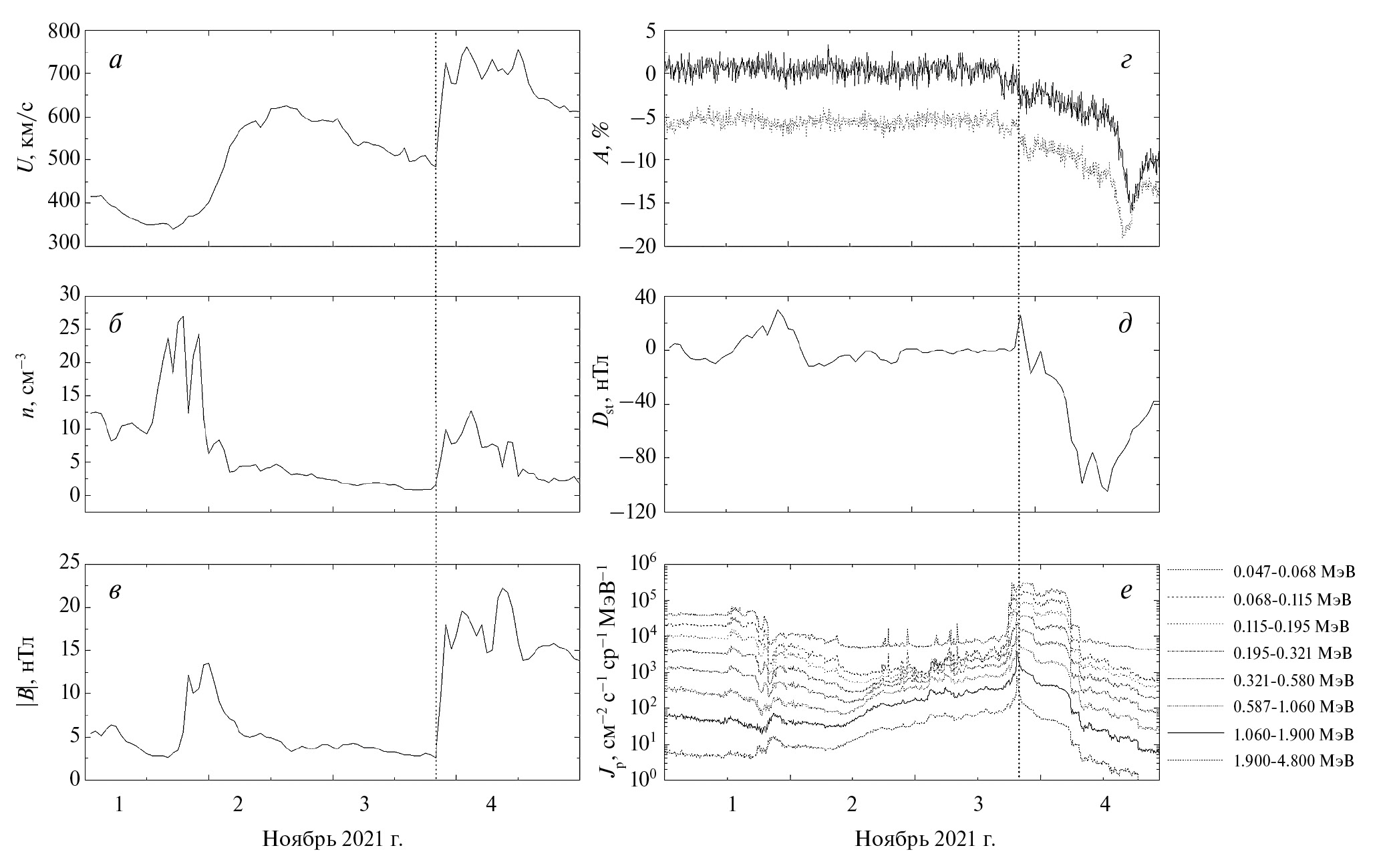 В 19:54 UT 3 ноября 2021 г. находящемся вблизи точки либрации L1 КА WIND была зарегистрирована МУВ (рис. 1а-1в). Она вызвала на Земле форбуш-понижение (рис. 1г) и умеренную геомагнитную бурю (рис. 1д). На рис. 1г наличие флуктуаций интенсивности КЛ перед форбуш-понижением и геомагнитной бурей не очевидно, т.к. они имеют малую амплитуду и их просто не видно на уровне фона. Поэтому для их выделения нужно применять методы спектрального анализа. Для их выявления мы выбирали реализацию исходных данных длиной в 1 сут., чтобы станции, имеющие разные приемные конусы, могли полностью «обозреть» доступную им часть небесной сферы. Далее, после приведения данных к квазистационарному виду с помощью цифровой фильтрации, мы использовали стандартный метод Блэкмена–Тьюки с использованием корреляционного окна Тьюки [13]. Таким образом, мы рассчитывали их автоспектры, кросс-спектры, а также коэффициенты когерентности с числом степеней свободы DoF ≈ 27. Подобным же образом рассчитывались и спектральные характеристики данных измерений параметров солнечного ветра на КА WIND.
