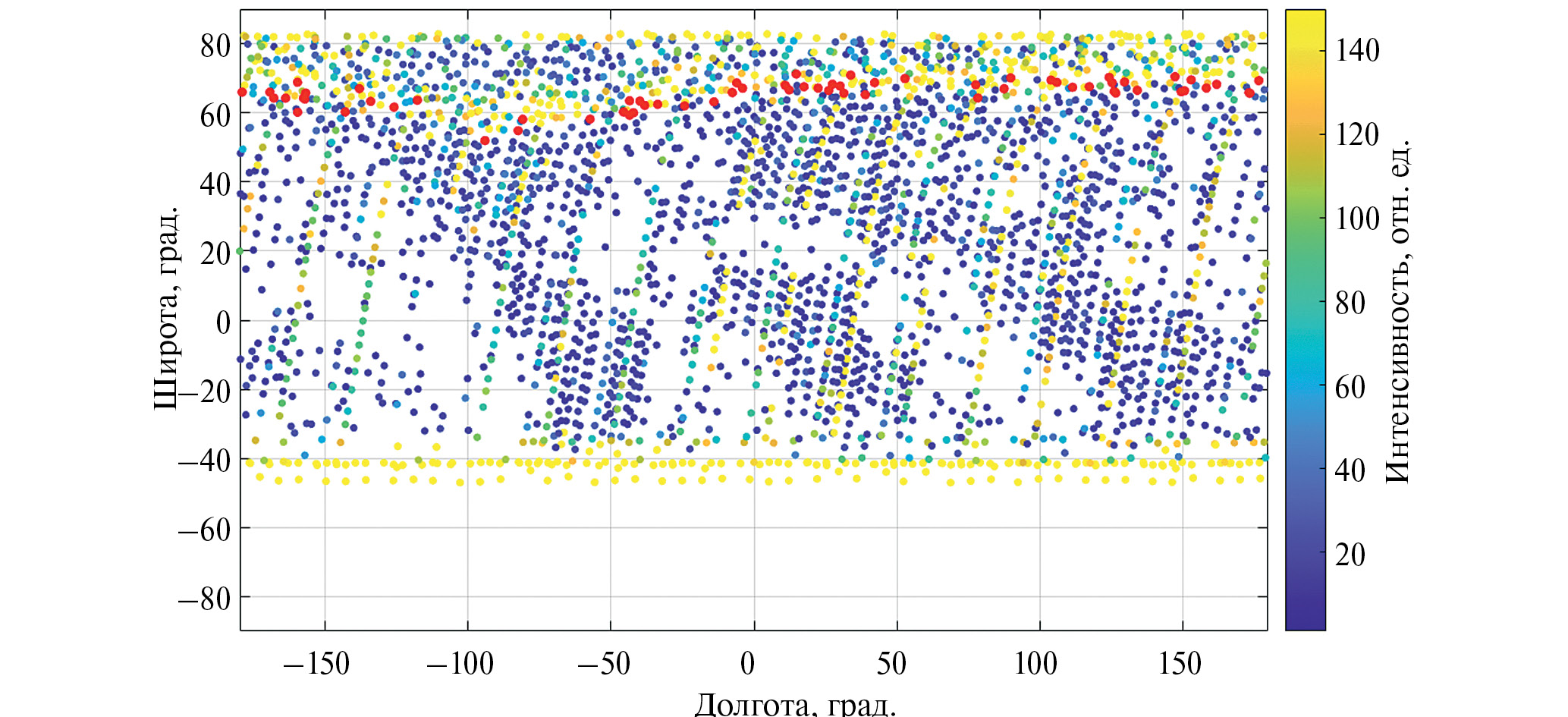 Рис. 1. Карта измерения интенсивности УФ-свечения детектором ТУС в первую неделю 2017 г. Цветом показана интенсивность в относительных единицах, красными точками – пульсирующие полярные сияния