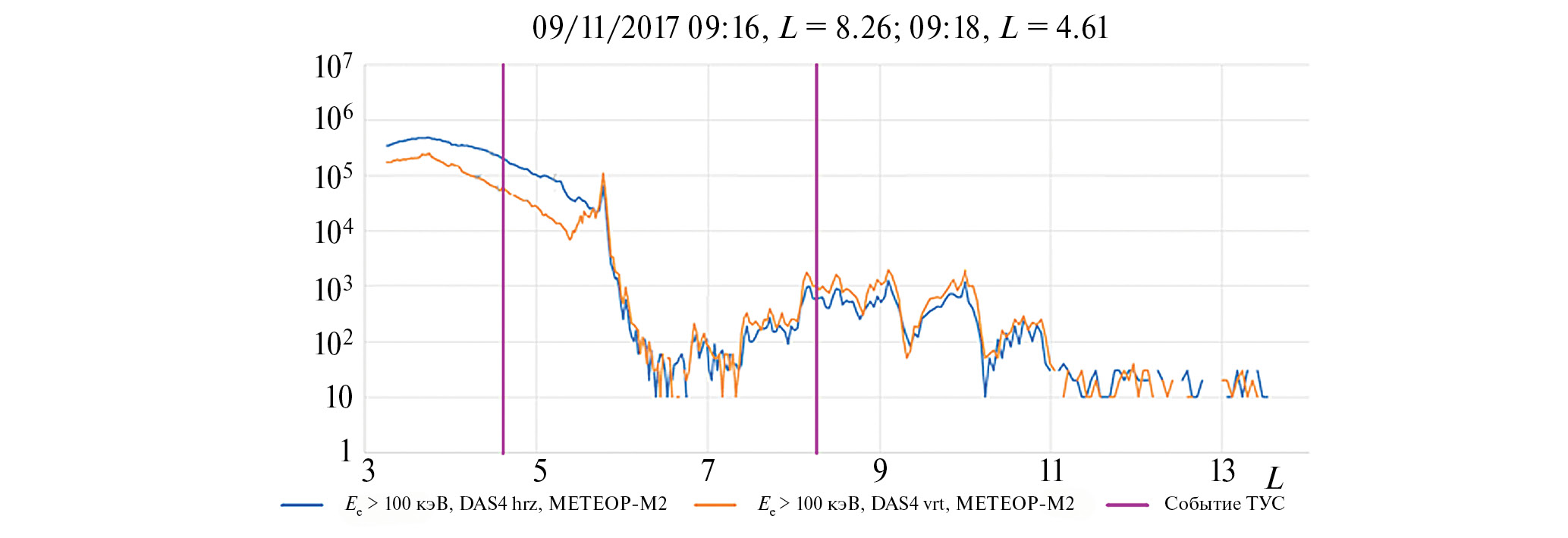 Для анализа потоков заряженных частиц были выбраны детекторы на спутнике МЕТЕОР-М2. На спутнике установлено несколько детекторов заряженных частиц, в том числе горизонтальный MGSI–M и вертикальный SKL–M, которые позволяют измерять потоки электронов с энергиями от 100 кэВ до 8 МэВ. Причем, в высоких широтах вертикальный детектор направлен примерно вдоль магнитного поля, поэтому измеряет в основном высыпающиеся частицы, а горизонтальный детектор – захваченные частицы. На рис. 2 приведен результат измерения потоков электронов с энергией более 100 кэВ во время регистрации двух событий детектором ТУС (отмечены вертикальными линиями). Первое событие (L = 4.61) произошло в районе максимума внешнего радиационного пояса (РПЗ), где потоки в 104 раз превышают фоновые значения, а второе (L = 8.26) в высокоширотной области повышенных потоков энергичных электронов (102 от фоновых значений), существенно вне РПЗ, причем наблюдается заметная изотропизация потоков (показания вертикального и горизонтального детекторов сравниваются), что означает присутствие значительной доли электронов, высыпающихся в атмосферу. Такая ситуация наблюдается в большинстве случаев, когда удается найти близкие по расположению в магнитосфере измерения двух космических аппаратов.