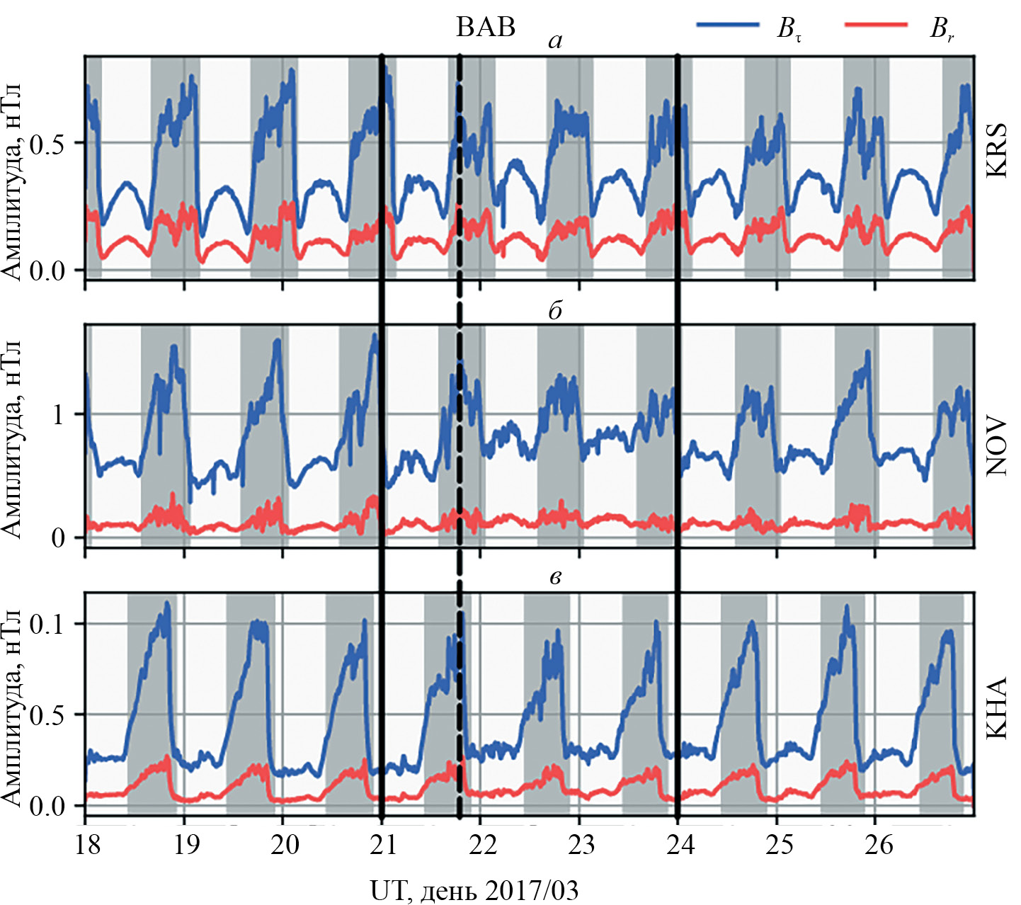 Из рис. 1 видно, что в компонентах поля всех рассматриваемых передатчиков наблюдается суточный ход. Тангенциальная компонента поля во всех случаях преобладает, что говорит о распространении преимущественно на поперечной магнитной моде (TM). У TM-волны вектор напряженности магнитного поля лежит поперек плоскости падения. Величина амплитуды в ночное время значительно превышает ее дневные значения. Однако в периоды возрастания геомагнитной активности (на рис. 1 этот участок отмечен вертикальными сплошными линиями) для передатчика KRS наблюдается снижение амплитуды поля вплоть до величины дневных значений. В эти периоды значения индекса SYM-H достигают –40 нТл, Kp — до 5, AL — до –1000 нТл. Менее выражен эффект ослабления амплитуд в ночное время для передатчика KHA (рис. 1в). Для передатчика NOV в это же время наблюдается скорее обратная ситуация: здесь величина компоненты Bτ как в ночные часы, так и в дневные увеличивается относительно значений в спокойных условиях. Отметим, что исходя из сравнительно небольших значений SYM-H-индекса такое событие является суббурей, развивающейся вне магнитной бури.