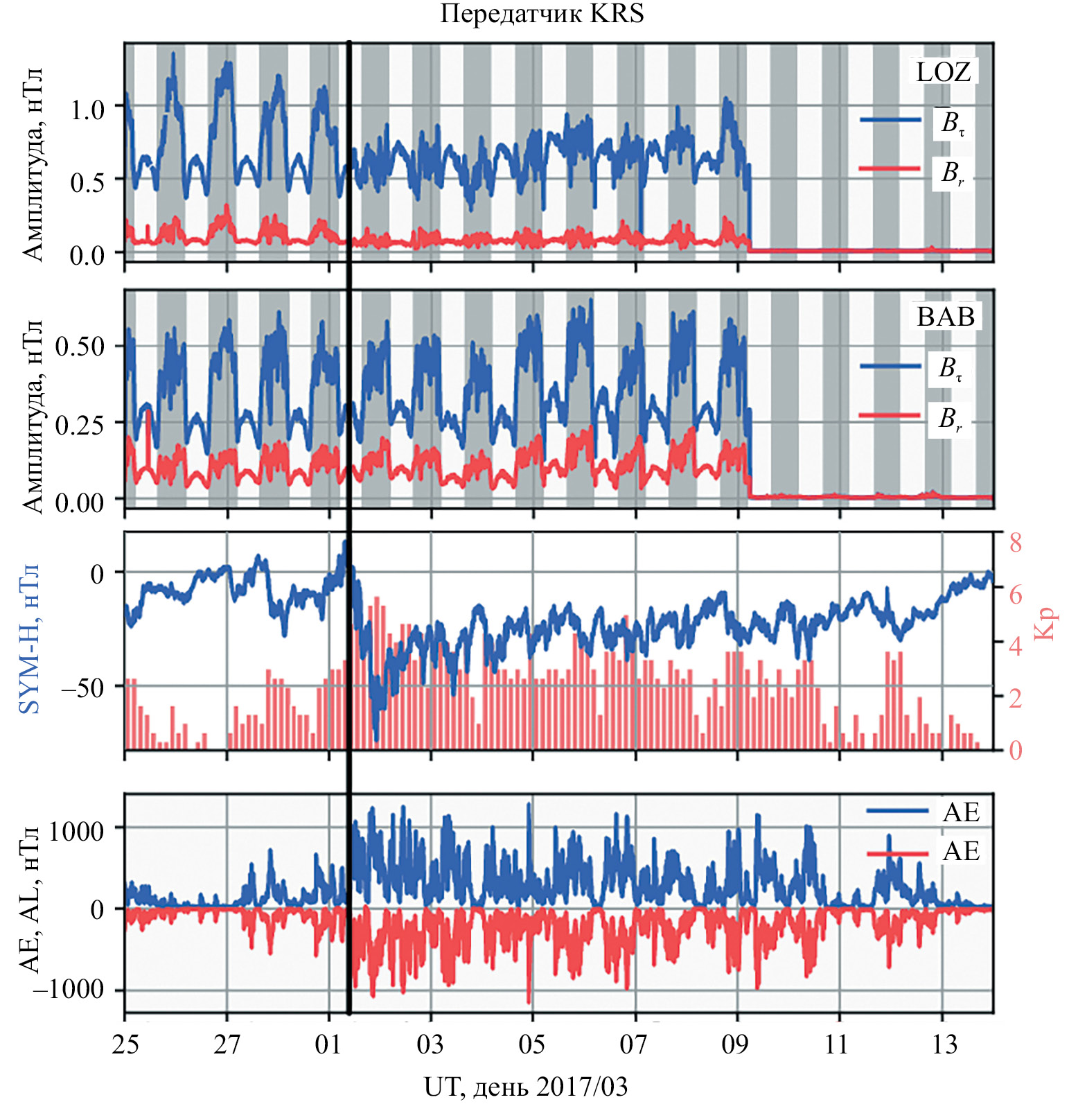 На рис. 4 приведены амплитуды компонент поля передатчиков, зарегистрированные в LOZ и BAB в период с 25 февраля по 14 марта 2017 г. Здесь в период резкого возрастания геомагнитной активности (SYM-H < –50 нТл, AL до –1000 нТл), начавшийся 1 февраля 2017 г., в LOZ регистрируется резкое снижение ночных амплитуд сигнала передатчика KRS вплоть до уровня дневных значений. При этом на уровне сигналов остальных передатчиков данный всплеск геомагнитной активности практически никак не отразился. Несколько иная ситуация наблюдалась на станции BAB. Здесь в амплитудах сигналов всех трех передатчиков эффекта влияния геомагнитной активности не наблюдалось вовсе.