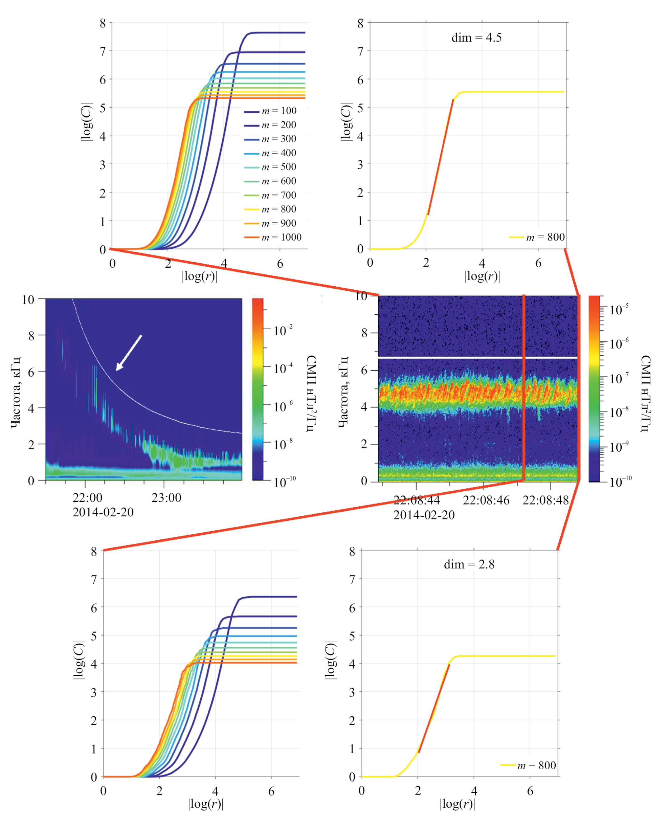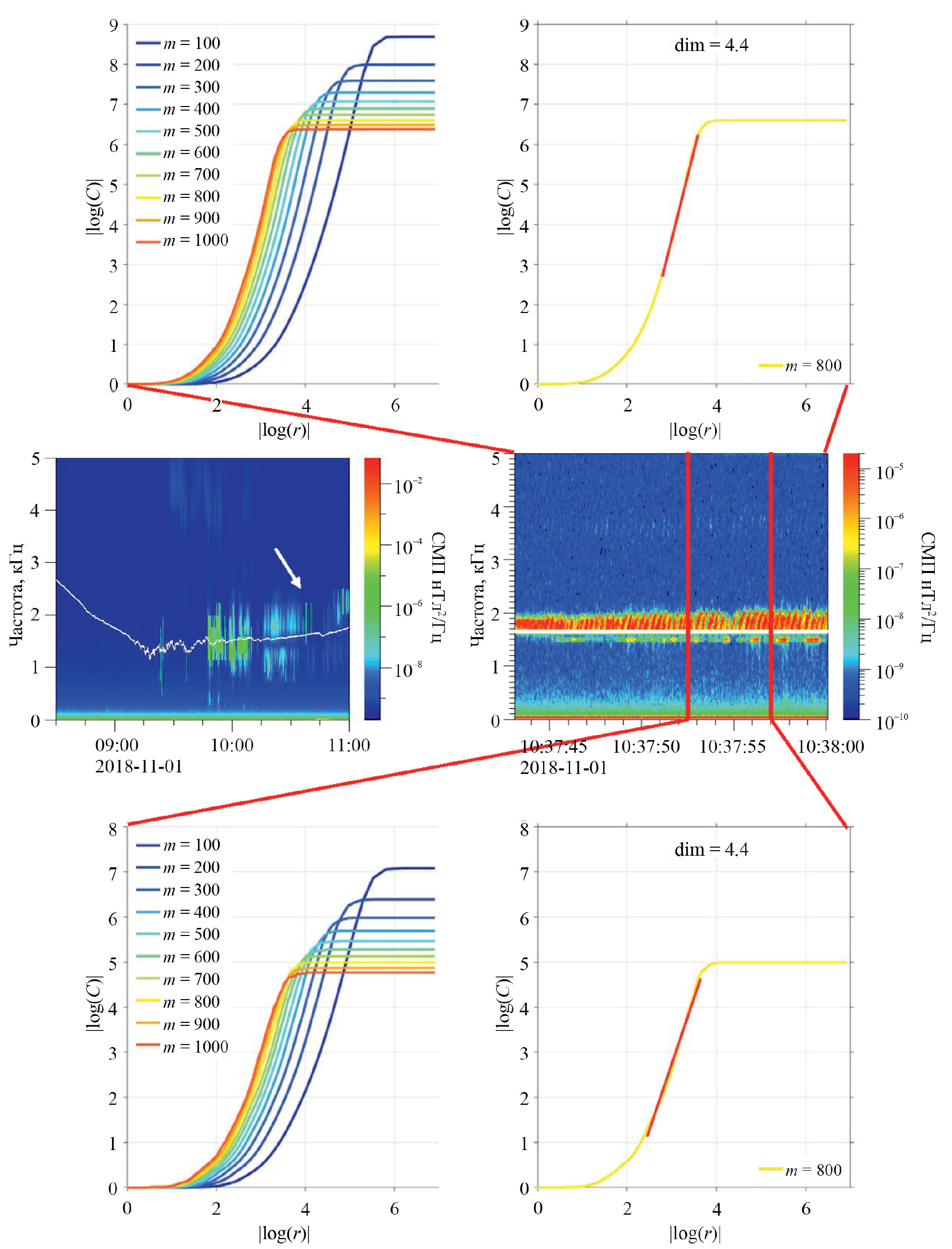 Рис. 1. Анализ всплеска хоров, зарегистрированного на космическом аппарате Van Allen Probe 2018-11-01 в 10:37:43 UT: на средней панели слева приведен динамический спектр низкого разрешения, на котором белой линией показана величина половины локальной гирочастоты электрона и стрелочкой — время регистрации всплеска хоров; на средней панели справа приведен динамический спектр хоров по данным высокого разрешения; на верхней панели слева приведены результаты расчета |log(C(m, r))| от |log(r)|; на панели сверху справа показан отрезок прямой, по тангенсу угла наклона которой определена величина размерности; на двух нижних панелях приведены результаты расчета размерности для фрагмента всплеска хоров, который расположен между двумя вертикальными красными линиями