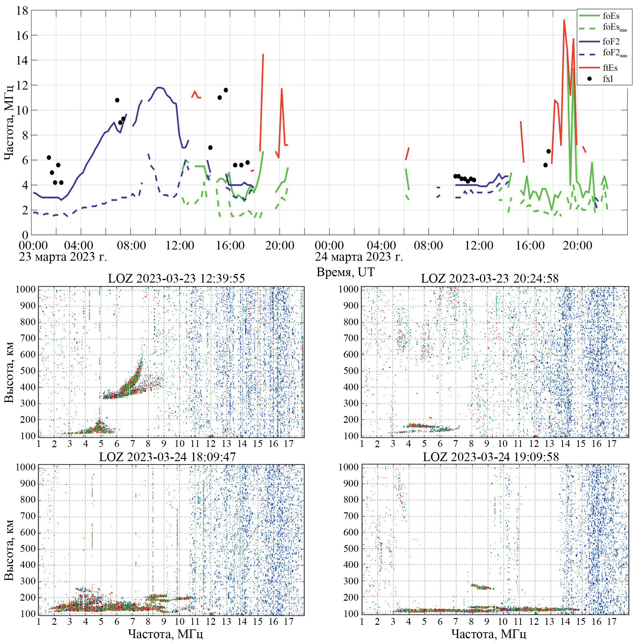 После полудня на ионограммах регистрируется интенсивный спорадический Es-слой, с преобладающим рассеянием типа r. На ионограммах область Es имеет хорошо выраженный плоский нижний край с расслоениями и рассеянными отражениями над ним. Начиная с 18:30 тип рассеяния от Es-области меняется. На ионограммах преобладает рассеяние типа f, сопровождающееся увеличением критических частот foEs и ftEs, а также полной экранировкой слоя F2. Начиная с 21:30 UT и до 06 UT следующего дня следы отражений на ионограммах отсутствовали из-за поглощения сигнала ионозонда вследствие высокой ионизации. 24 марта до 18 UT наблюдались слабые периодические отражения от F2- и Es-областей ионосферы. С 18 UT резко увеличивается интенсивность отражений от Es-слоя, на ионограммах видны следы от областей различной ионизации на высоте Es. Подобная структура ионограмм, как правило, наблюдается в период магнитных возмущений, сопровождаемых полярными сияниями.