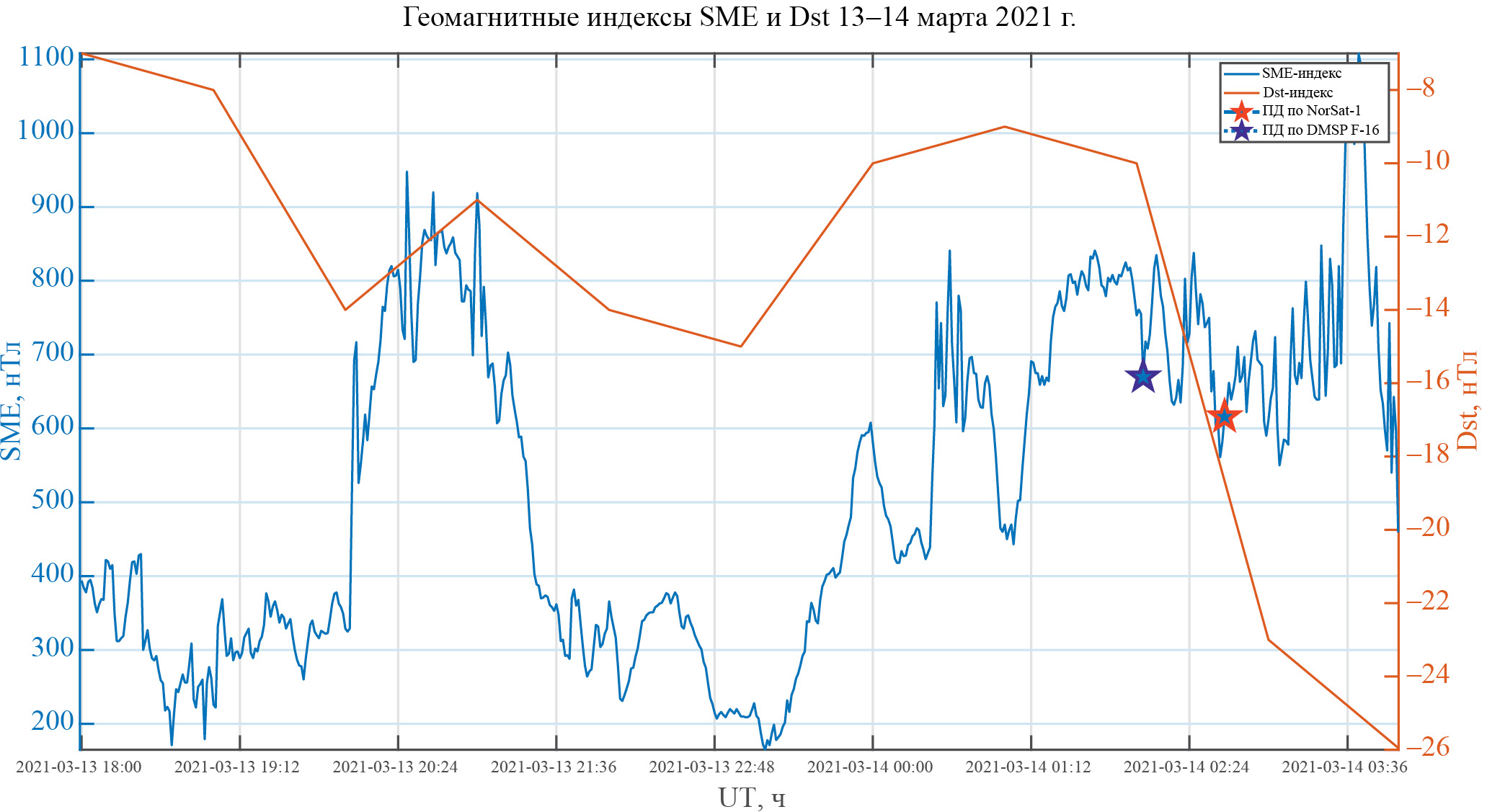 В данном исследовании мы рассматриваем геомагнитное событие 14.03.2021. На рис. 1 показана эволюция индексов SME и Dst, характеризующих геомагнитную обстановку, с 18 UT 13.03.2021 до 04 UT 14.03.2021. Моменты времени пересечения ПД спутниками DMSP F-16 (в 02:02 UT) и NorSat-1 (в 02:40 UT) отмечены синей и красной звездочкой соответственно. Индекс SME, характеризующий авроральный электроджет, составляет 600—700 нТл в 02 UT, что свидетельствует об умеренно высокой геомагнитной активности в авроральных и субавроральных широтах. Во время данного геомагнитного события магнитная компонента Bz межпланетного магнитного поля была отрицательной, также в это время регистрировался быстрый солнечный ветер (Vx ~ –550 км/с). Отметим, что наблюдалось постепенное падение геомагнитного индекса Dst на протяжении достаточно длительного времени, а в момент обнаружения ПД имело место локальное снижение Dst с ~02:00 UT 14.03.2018 (см. рис. 1).